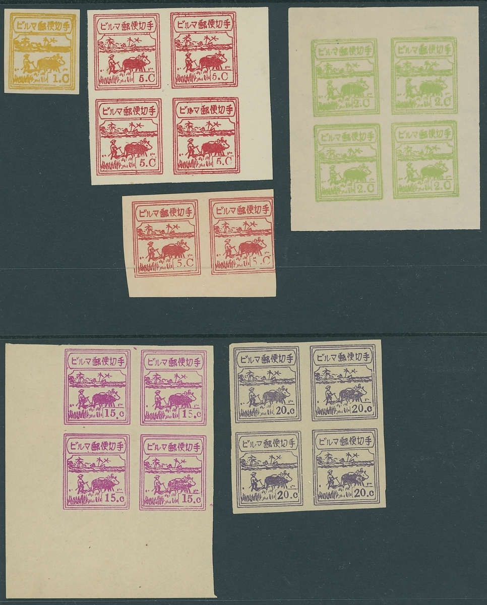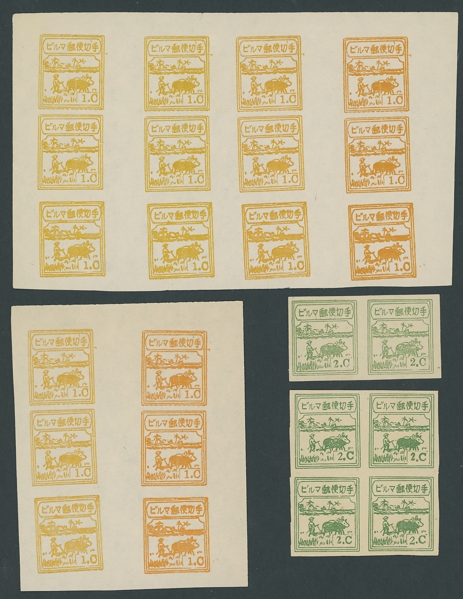 1c. blocks of twelve (4x3, last column in a different shade) and six (2x3) and a single, 2c. yellow-green block of four, 2c. green pair. 2c. blue-green block of four, 5c. large "C" block of four and a pair printed both sides,, 10c. marginal vertical pair, 15c. lower left corner block of four, 20c. block of four and 30c. top marginal block of four, fine