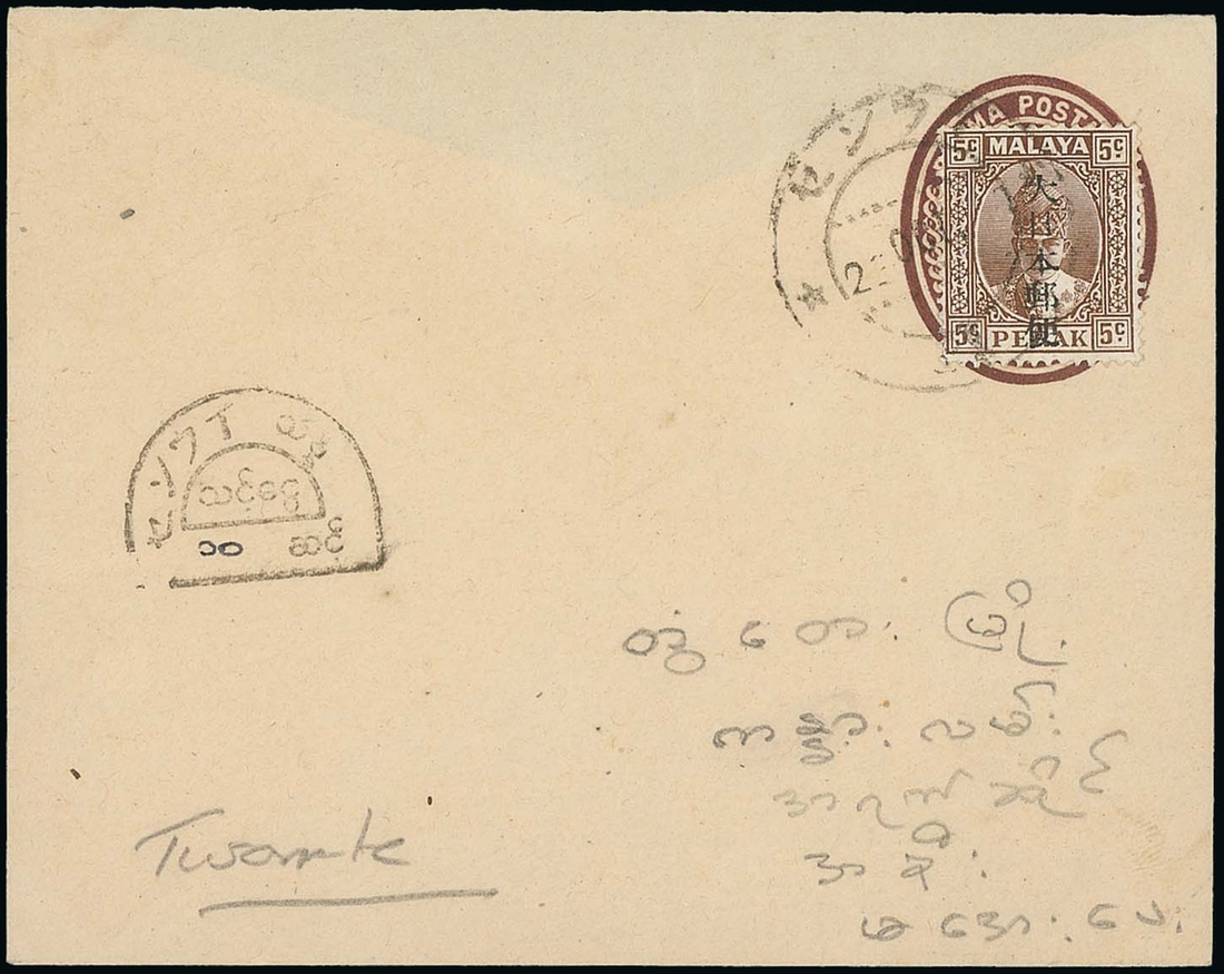 1944 (23 Oct.) India stationery envelope from Hsenwi with 5c. affixed over stamp impression, clearly tied by Japanese type c.d.s. and showing horse-shoe Postage Due h.s. for 5c. Photo