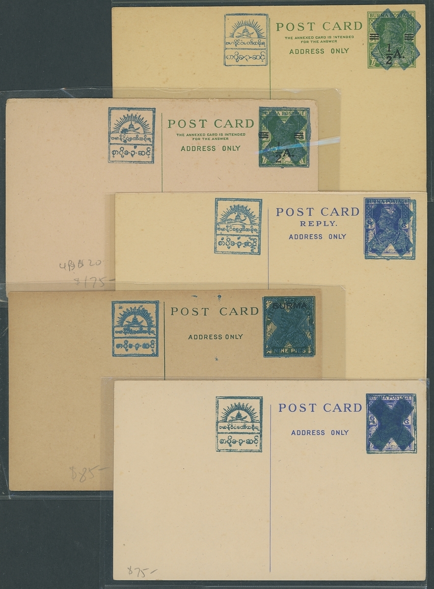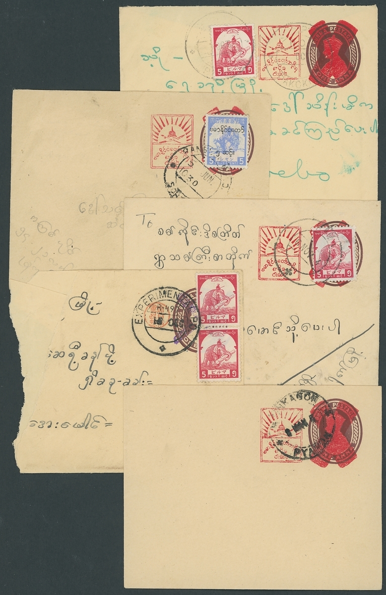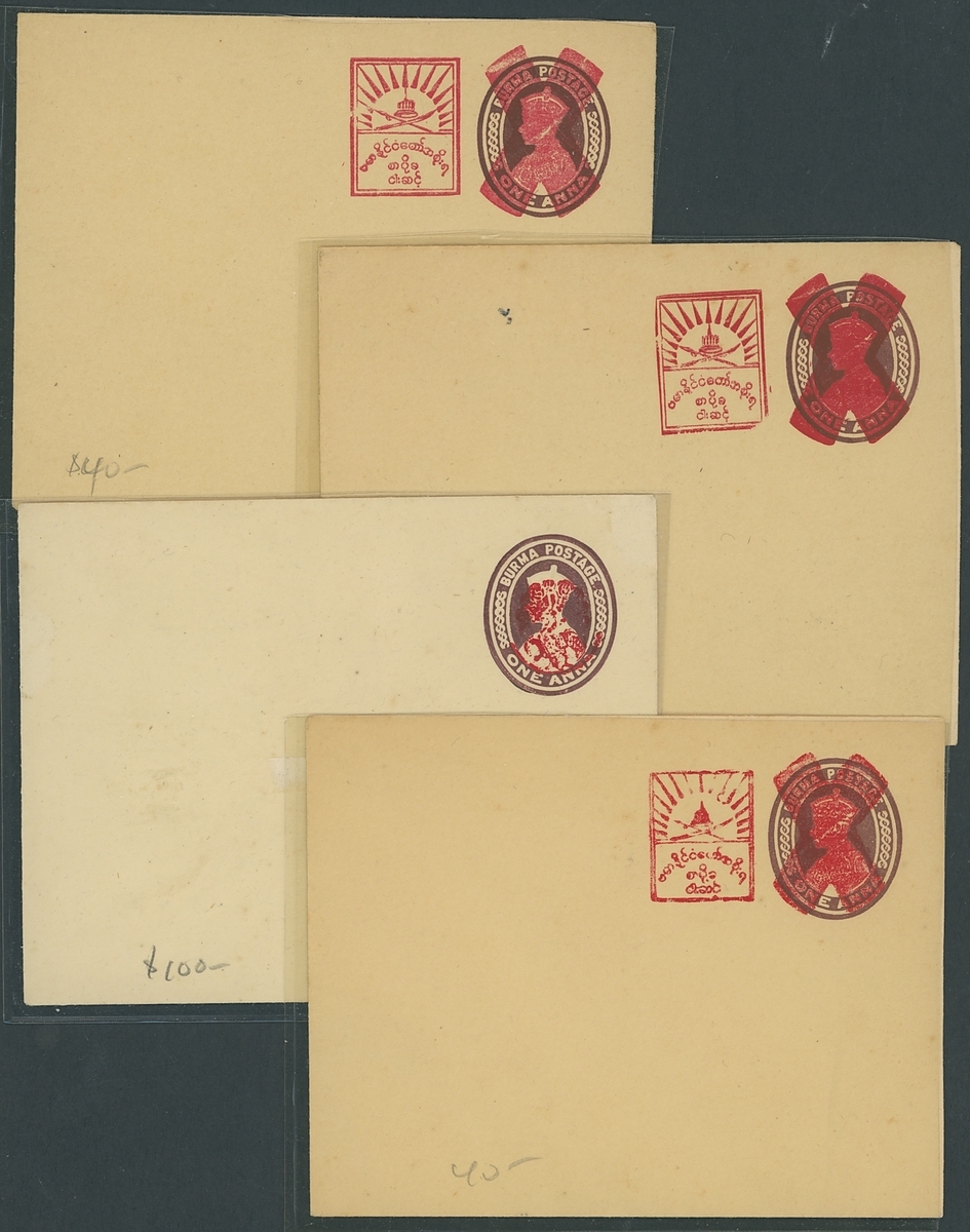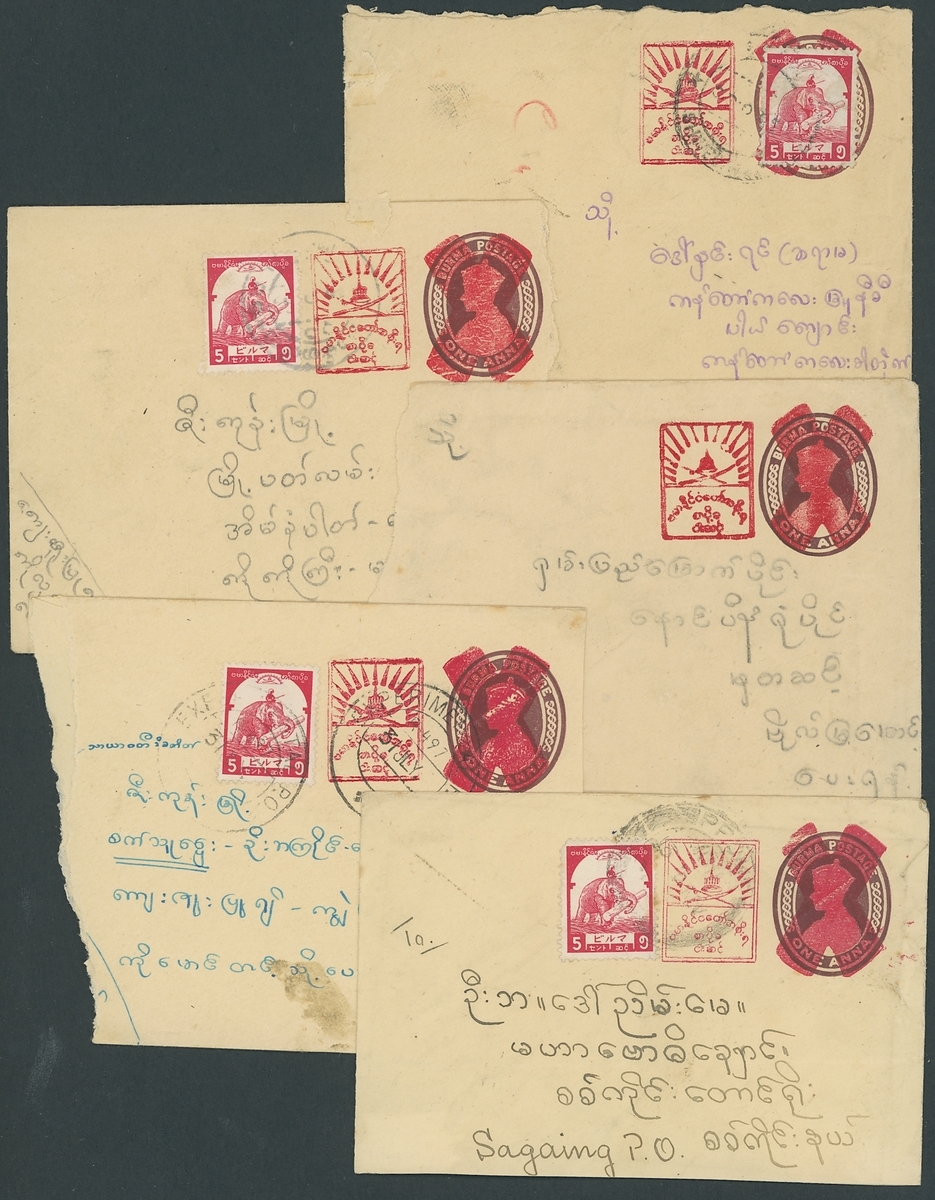 A duplicated accumulation including Japanese Army Administration cards (6) and envelopes (6, two used); cards (16) and envelopes (26, twenty-one used, most bearing adhesives though condition very mixed) with Burma State Crest h.s., and 1a. envelopes with framed