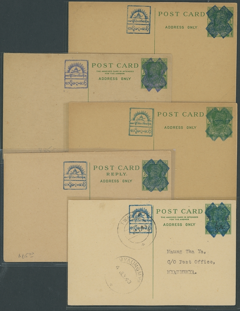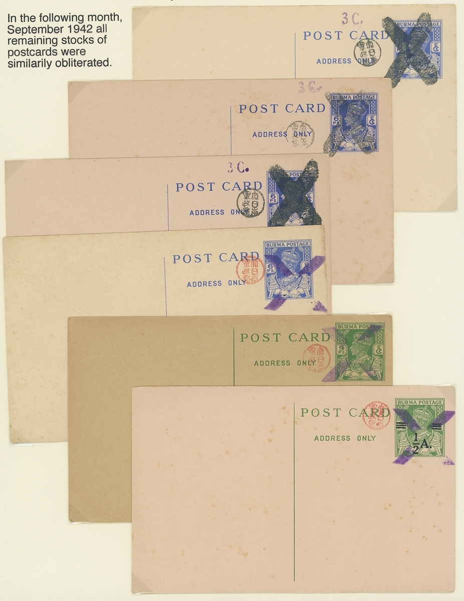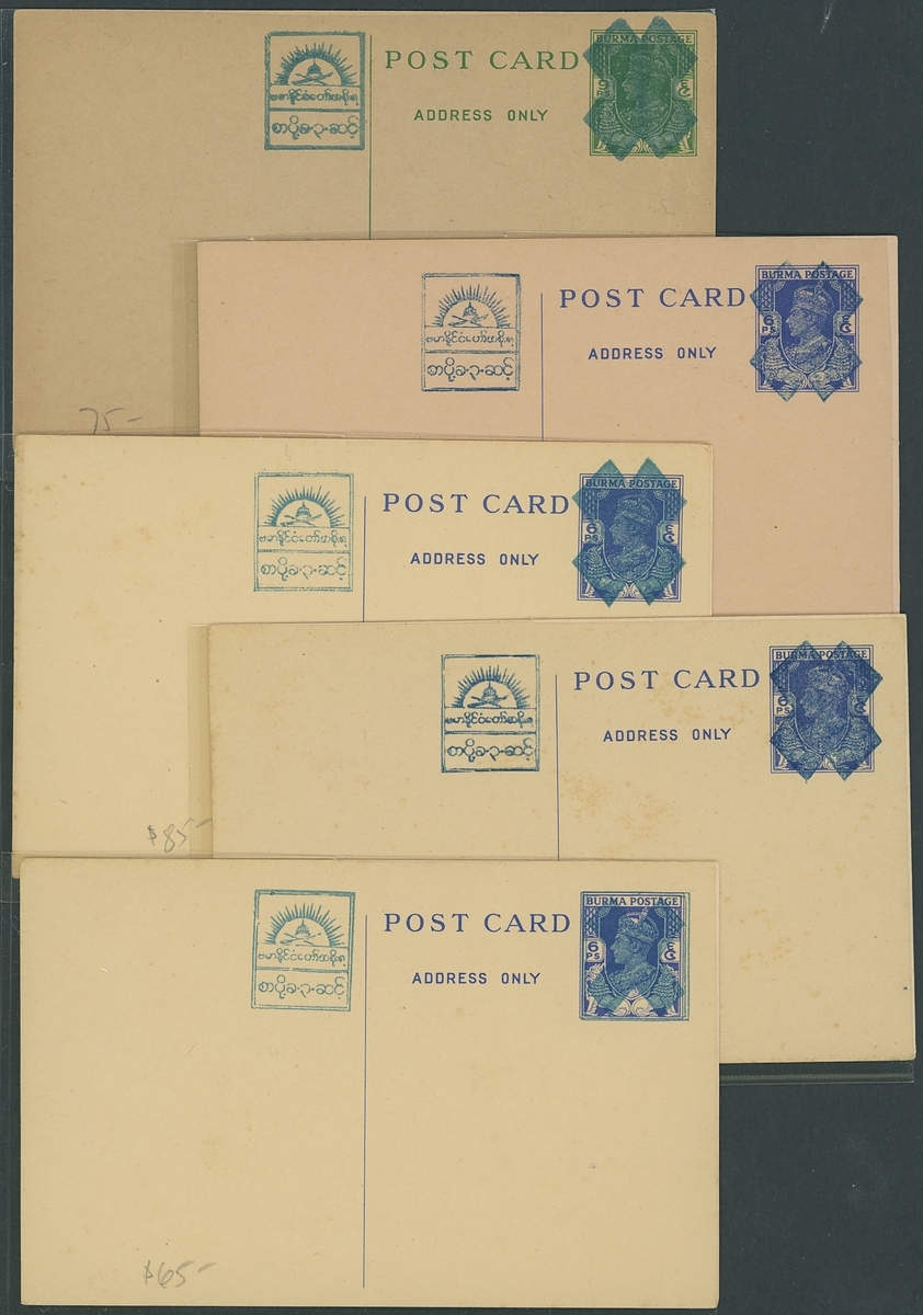 A duplicated accumulation including Japanese Army Administration cards (6) and envelopes (6, two used); cards (16) and envelopes (26, twenty-one used, most bearing adhesives though condition very mixed) with Burma State Crest h.s., and 1a. envelopes with framed