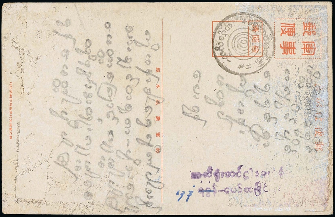 Military mail picture postcard from a member of the Heiho Corps of Burmese workers, enticed to work on the Thailand Railway, at Moulmein, showing a fine strike of the vernacular Labour Corps Post Office 3 Free Postage circular handstamp. Scarce. Photo