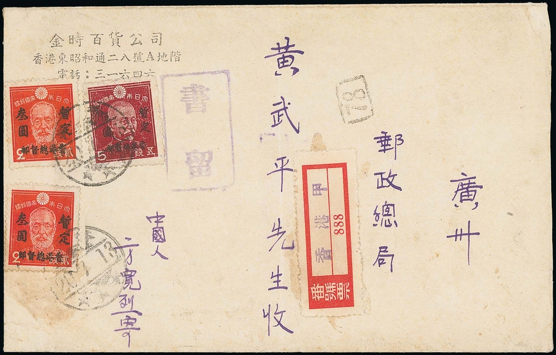 1945 (13 July) envelope registered from Hong Kong to Canton, bearing 3y. on 2s. (2) and 5y. on 5s., all clearly tied, showing registration label, violet censor chop with arrival d.s. (17.7) on reverse. Attractive. Photo