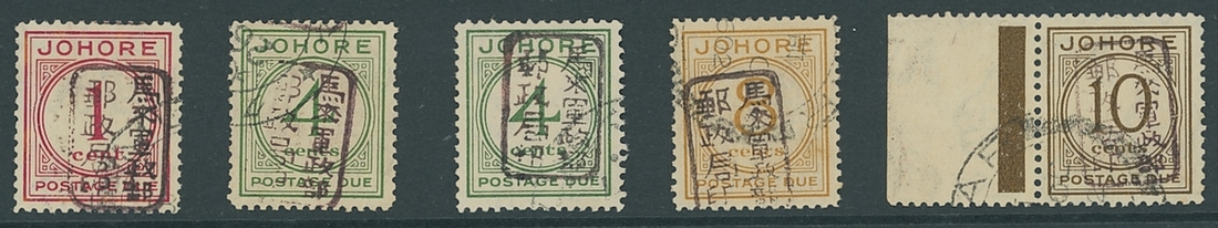 1c. Type M, 4c. Types F (BPA certificate, 2016) and M, 8c. Type D (BPA certificate, 2016) and 10c. (marginal) Type D, all with brown overprint, fine used. ISC JD8-JD11, $1,925; S.G. JD1-JD4, £565