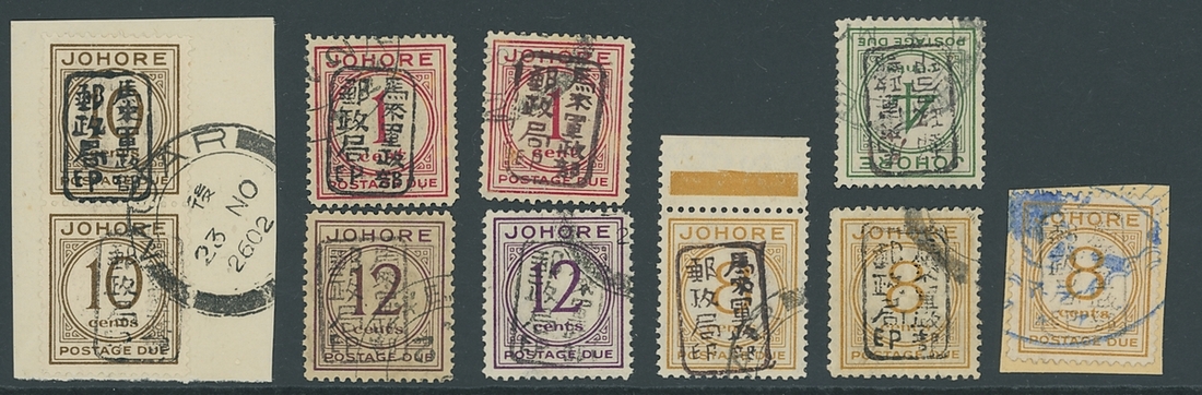 1c. Types E and M, 4c. Type F, 8c. Types D, E and H (on fragment cancelled in blue), 10c. Type L vertical pair on piece and 12c. Types A (lightly toned) and E, all with black overprint, fine used. ISC JD8a-JD12a, $2,840: S.G. JD1a-JD5a, £765