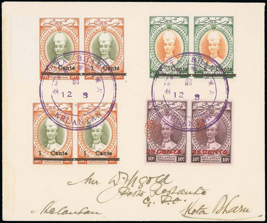 25c. on 10c. purple horizontal pair used with 1c. on 50c. (2) and 2c. on 40c. remainder pairs with one in each showing "Cente" for "Cents", all tied by large Japanese type Kota Bharu c.d.s. in violet on locally addressed philatelic envelope, fine. ISC JK9, $14,000; S.G. J24, £5,000. Photo