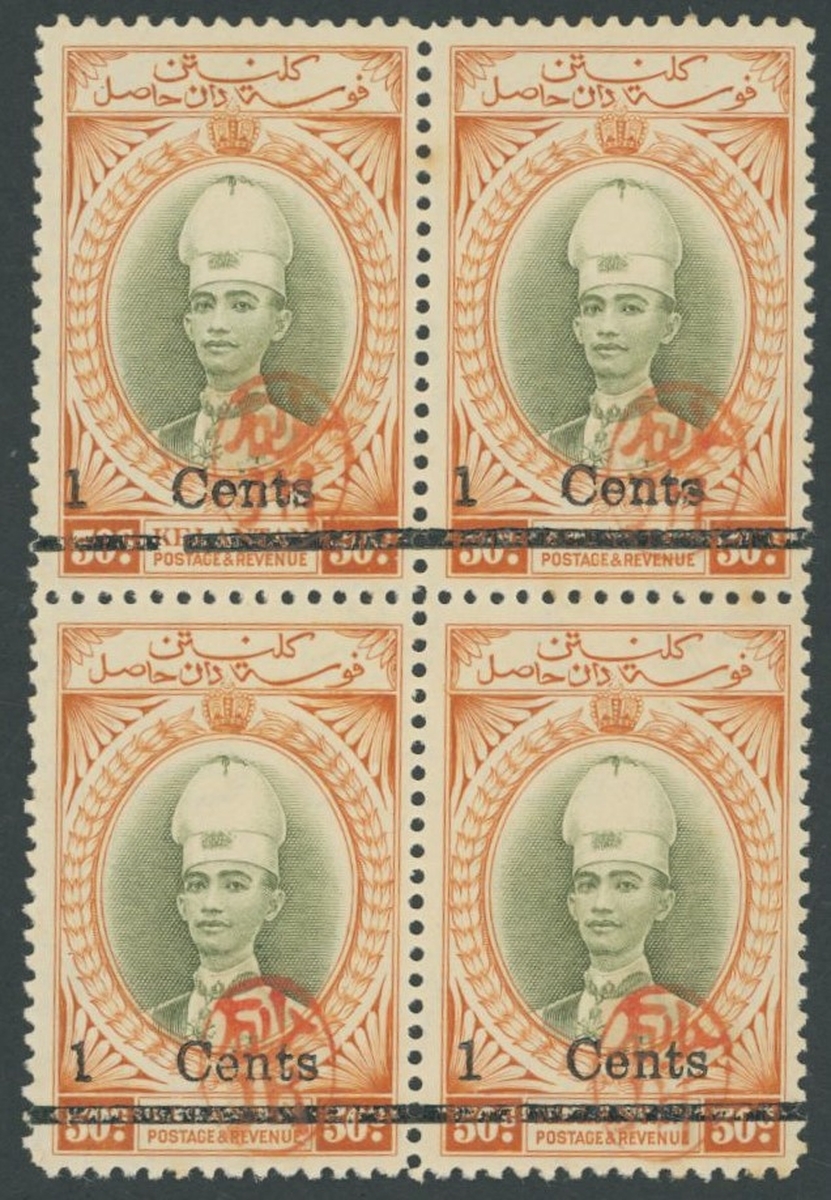 1c. on 50. grey-olive and orange block of four, unused without gum, fine. A scarce multiple. ISC JK16, $4,000; S.G. J32, £1,300