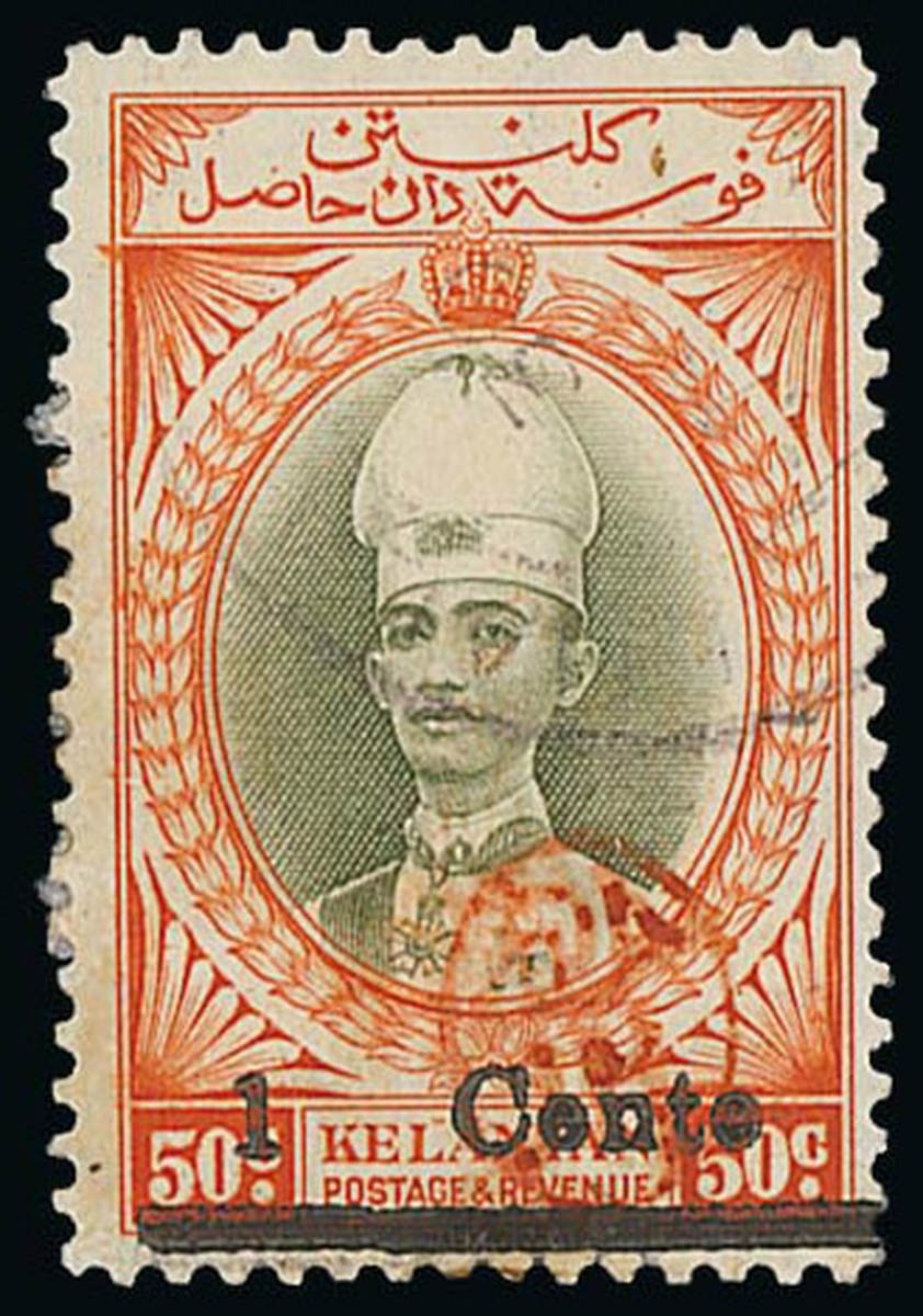 1c. on 50c. grey-olive and orange showing variety "Cente" for "Cents", slight horizontal crease otherwise fine used. Rare. B.P.A. Certificate (2010). ISC JK16a, $6,000; S.G. J32a, £1,700. Photo