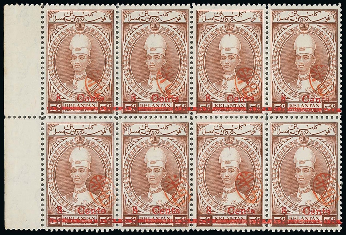 8c. on 5c. red-brown block of eight (4x2) with margin at left, the lower left stamp showing "Cente" for "Cents", slightly gum toned, fine mint. Rare. B.P.A. Certificate (2013). ISC JK27/27a, $8,800; S.G. J43/43a, £2,700. Photo