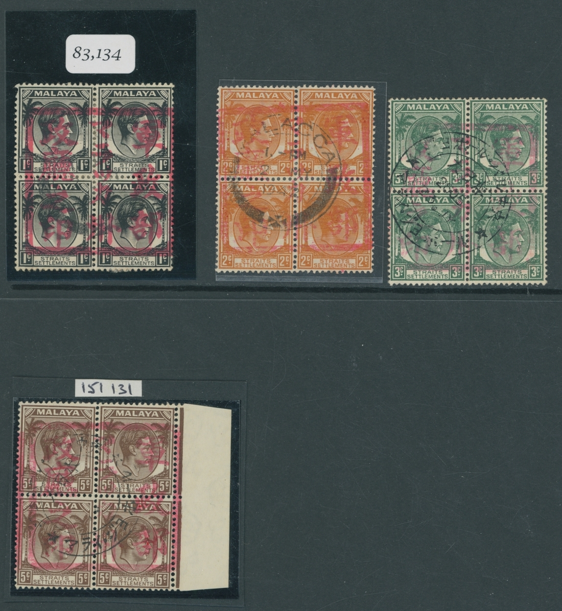 1c. black (B.P.A. certificate, 2014), 2c. orange, 3c. green and 5c. brown (R.P.S. certificate, 1990) blocks of four, the 1c. and 2c. with central Malacca double-ring d.s (Type D27), the others with Johore Bahru Japanese type c.d.s (Type JD4); the 1c. with small defect at top left corner, otherwise fine. ISC J128-J131, $5,400+; S.G. J45-J48, £2,750++