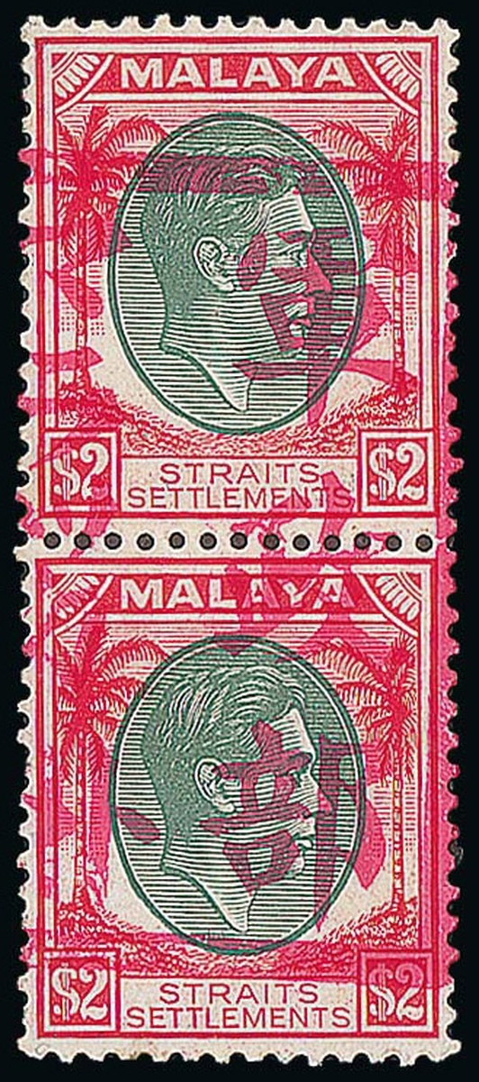 $2 green and scarlet vertical pair showing right half of handstamp, unused with large part original gum, fine. Very rare, only thirteen examples believed to exist of which two are in pairs. B.P.A. Certificate (2013). ISC J140, $26,000; see footnote after S.G. J55. Photo