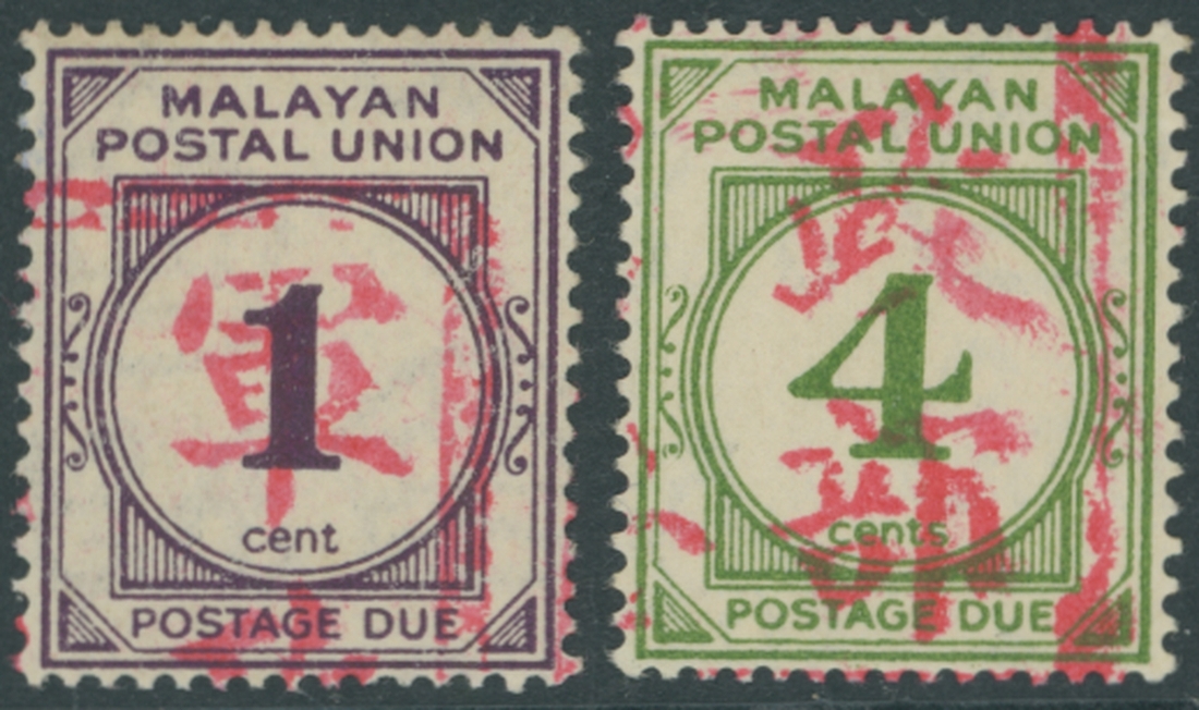 1c. slate-purple from top right corner and 4c. green from lower right corner, fine mint. Both initialled "MDR". ISC JD17-JD18, $1,950; S.G. JD11-JD12, £550
