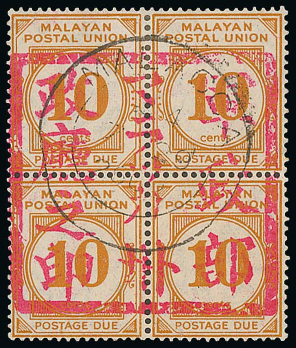 10c. yellow-orange block of four centrally cancelled by Malacca double-ring d.s. (Type D26), fine. B.P.A. Certificate (2013). ISC JD20, $10,800+; S.G. JD14, £3,000+. Photo