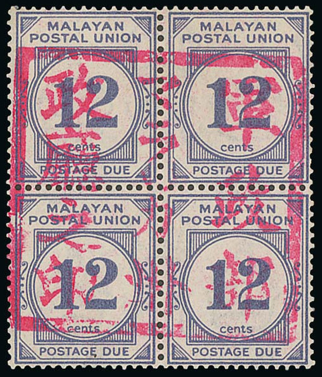 12c. ultramarine block of four, unused with large part original gum, fine. A very rare multiple. B.P.A. Certificate (2024). ISC JD21, $18,000+; S.G. JD15, £6,000+. Photo