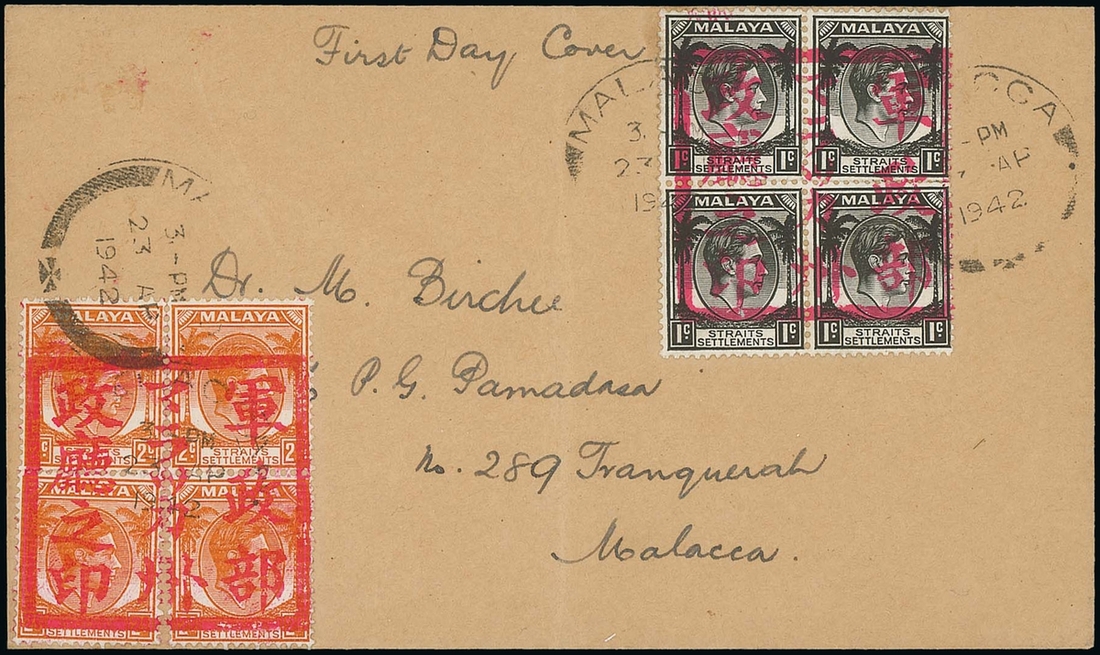 1942 (23 Apr.) locally addressed envelope bearing 1c. black and 2c. orange blocks of four (the latter separated vertically), both tied by Malacca double-ring d.s. (Type D27) on day of issue, no other markings; envelope with central vertical fold well clear of adhesives. B.P.A. Certificate (2021). Photo