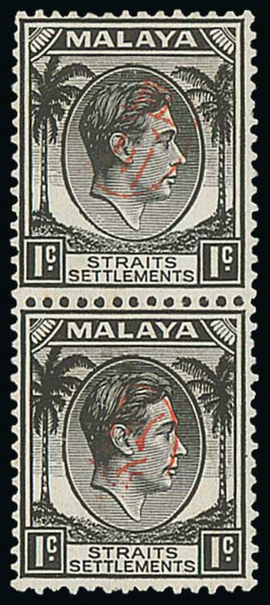 1c. black vertical pair, the lower stamp with overprint inverted, unused with large part original gum, fine. Rare. B.P.A. Certificate (1997) for a block of four from which this pair was removed. Unlisted in ISC and S.G. Photo