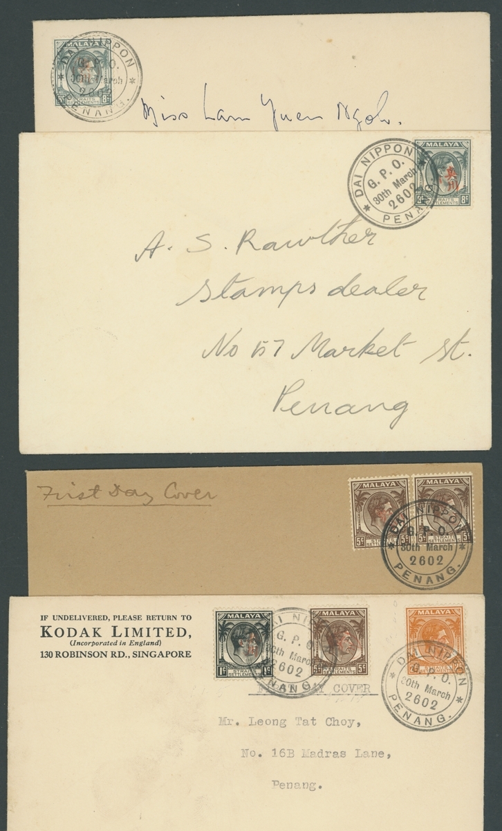 1942 (30 Mar.) locally addressed philatelic envelopes (4), one bearing 1c., 2c. and 5c., one bearing 5c. pair and two bearing an 8c., all tied by
