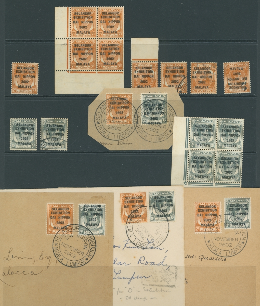 2c. orange mint lower right corner block of four and singles (3, one with overprint inverted, some extraneous ink marks, initialled "MDR") and used (3, one on piece with 8c.), and 8c. mint lower left corner block of four and singles (3, two with inverted overprint) and used (2, one with inverted overprint); also three covers bearing the pair of stamps with one 8c. showing