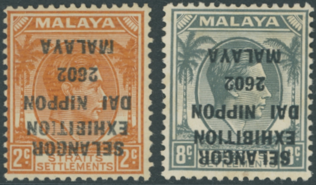 2c. orange and 8c. grey both with overprint inverted, fine mint, the latter with hinge remnant at top. B.P.A. Certificate (1999) for 8c. ISCJ201b-J202b, $2,600; S.G. J90b-J91b, £650