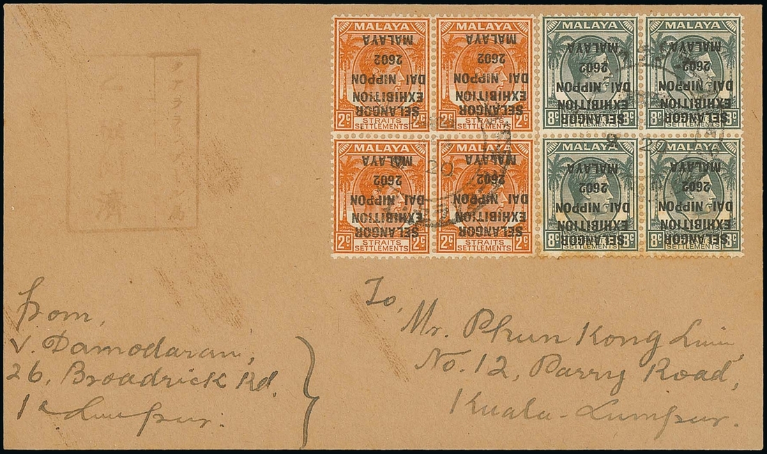 2c. orange and 8c. grey, both in a block of four showing overprint inverted, cancelled by Japanese type c.d.s. on locally addressed envelope; the 8c. block with some light staining to lower pair. ISC J201b-J202b, $12,000; S.G. J90b-J91b, £3,200. Photo