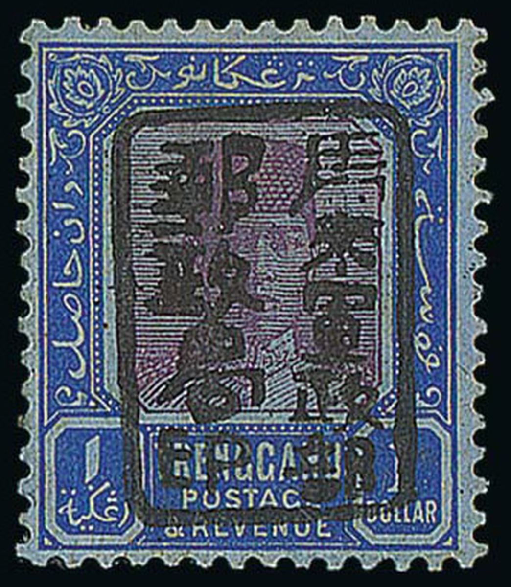 $1 purple and blue on blue with Type A, unused with part original gum (some hinge remnants), fine. Extremely rare, only twenty-two issued. R.P.S. Certificate (2001). ISC J122, $18,000; S.G. J113, £6,500. Photo
