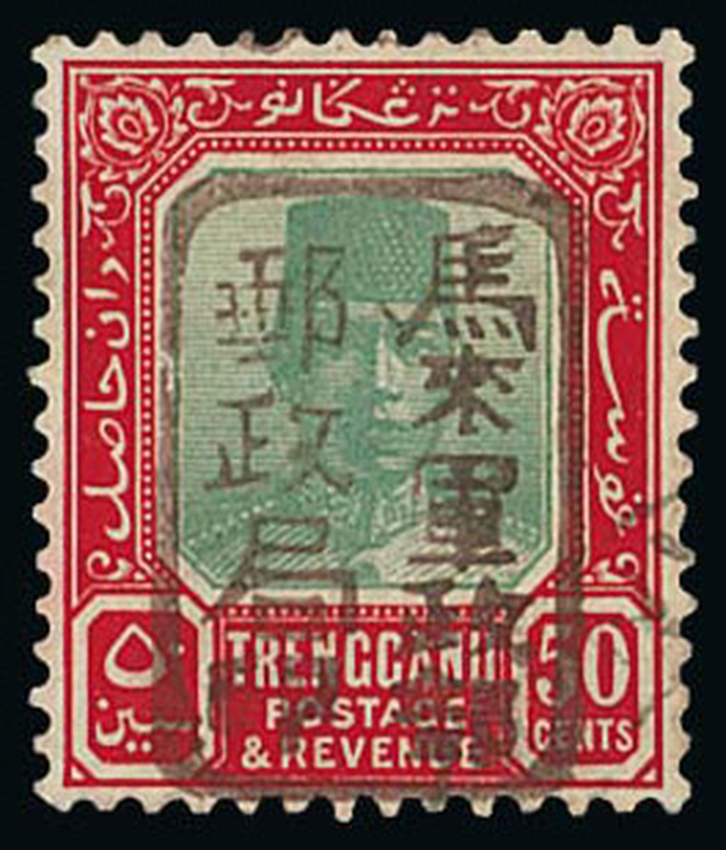 50c. green and bright carmine with Type F, fine used. B.P.A. Certificate (2020) states "brown - a mixture of inks". Unlisted in ISC and S.G. Photo