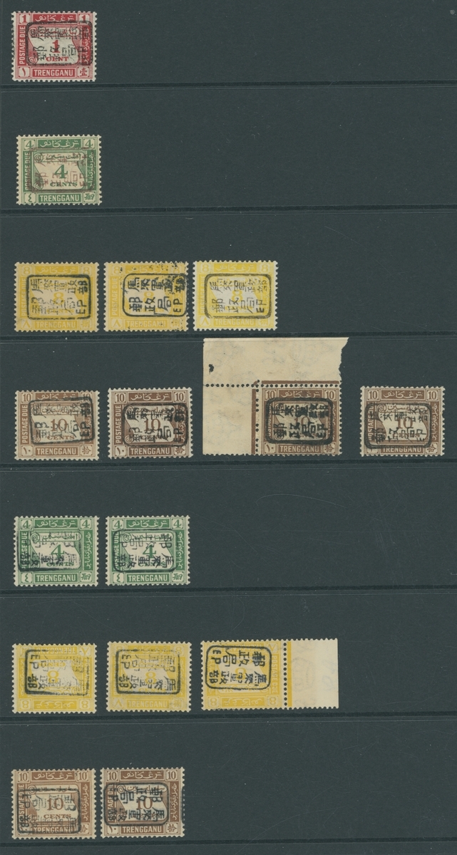 A mint range with L to R 1c. Type F, 4c. Type F in brown, 8c. Types A (browned gum), E (browned gum) and F, and 10c. Types A, E and F (2, one from top left corner; one with pulled perf at right), and R to L 4c. Types A and E in black, 8c. Types A (2, one with browned gum) and E, and 10c. Types A and E; fine. ISC, $1,820; S.G. JD17-JD21, £485