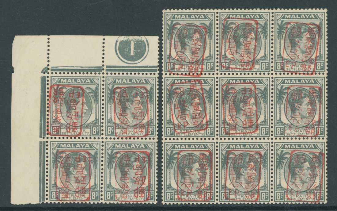 8c. grey, Type E, top left corner block of four with plate number with handstamps inverted, and a block of nine with the centre stamp showing handstamp inverted; the former with thin in selvedge otherwise fine mint. ISC J18/d, unpriced; Unlisted in S.G.