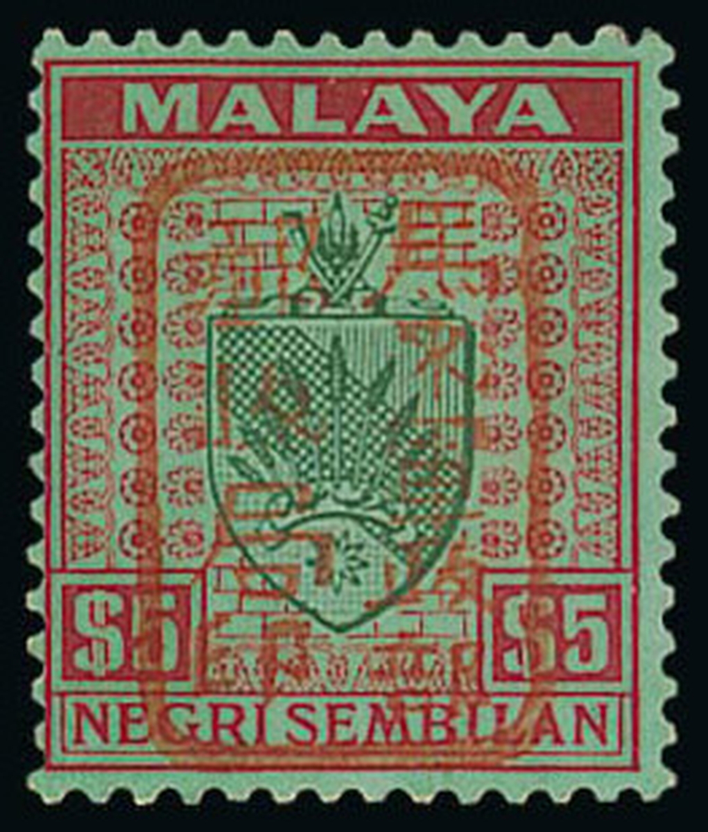 $5 red and green on emerald with Type D, unused with large part original gum, fine. Rare. R.P.S. Certificate (2001). ISC J44a, $6,000; S.G. J175a, £2,500. Photo