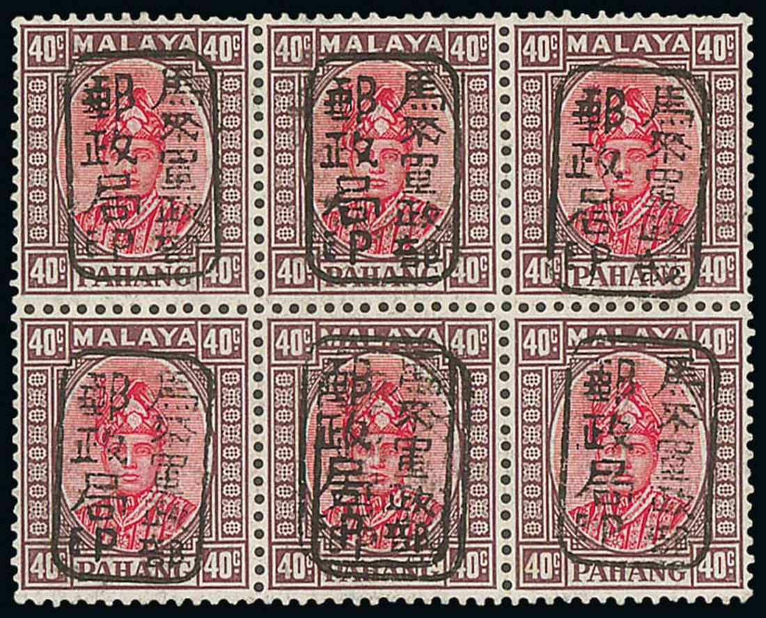 40c. scarlet and dull purple with Type E, a block of six (3x2), the centre stamp in the lower row with handstamp double, fine mint. ISC J61/61b, unpriced; Unlisted in S.G. Photo