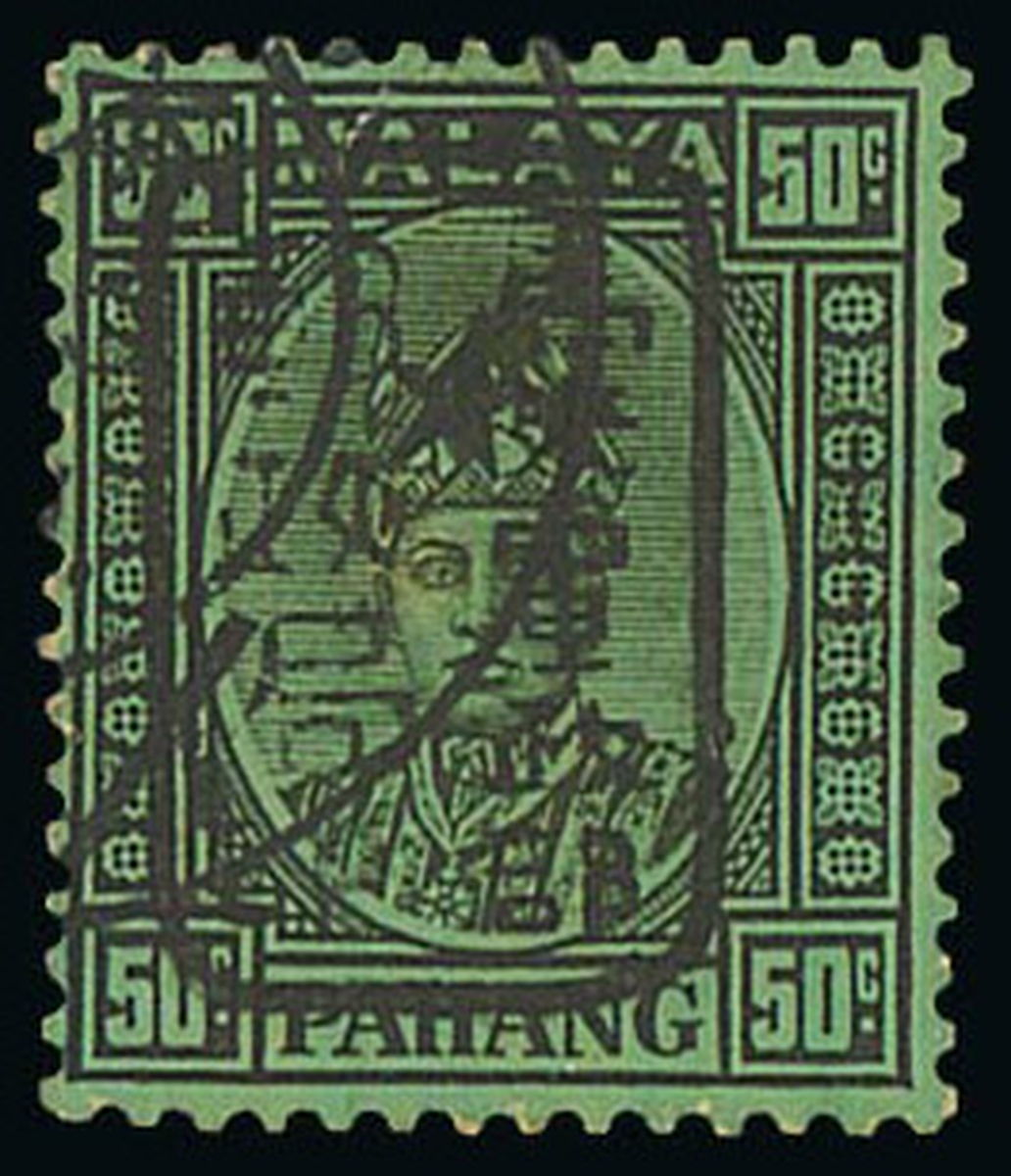 50c. black on emerald with Type E, fine used. Rare. R.P.S. Certificate (2014). ISC J62, $6,000; S.G. J187, £2,000. Photo