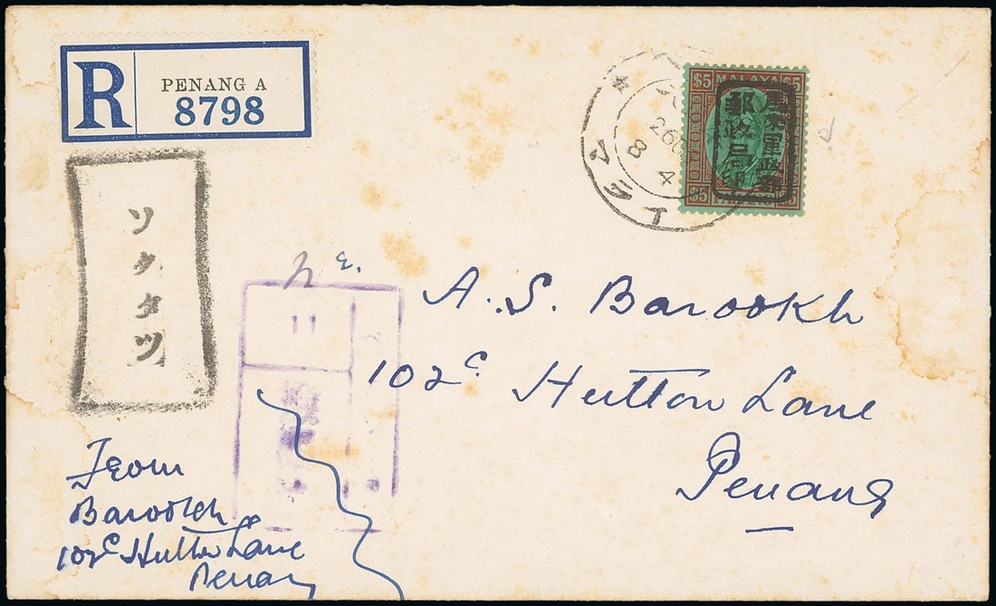 $5 green and red on emerald with Type D, neatly tied by Penang Japanese type c.d.s. (Type JD10) on 1945 (4 Aug.) locally addressed and registered envelope showing two different censor chops at left; the envelope with a few light stains. ISC J64, $3,800 off cover; S.G. J189, £1,200 off cover. Photo