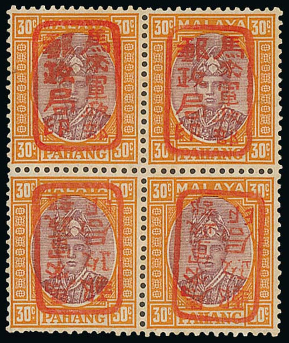 30c. dull orange and purple block of four with Type D, the lower pair with handstamps inverted, fresh and fine unmounted mint. Rare. B.P.A. Certificate (2011); ISC J60c, variety unlisted; S.G. J185a, variety unlisted. Photo