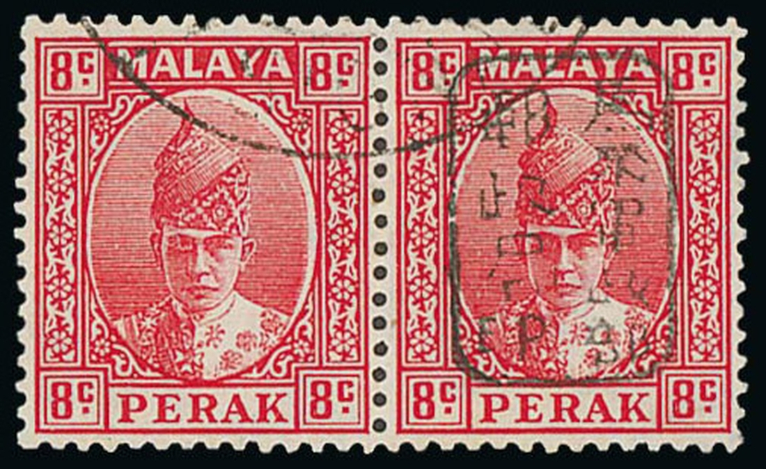 8c. scarlet horizontal pair with Type E, the left stamp with handstamp omitted, fine used. Rare. Unlisted in ISC and S.G. Photo