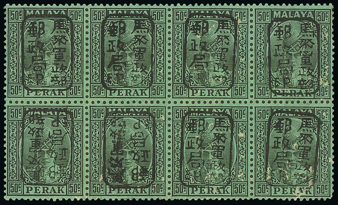 50c. black on emerald block of eight (4x2) with Type E, the lower left pair with handstamps inverted, unused with full original gum; the lower right pair with some surface damage otherwise fine. Rare. ISC J81/81a, unpriced; Unlisted in S.G. Photo