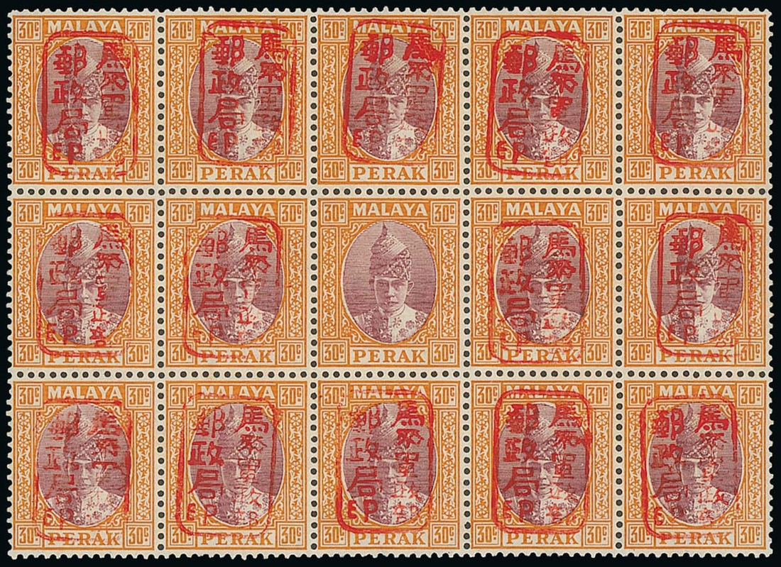 30c. dull purple and orange block of fifteen (5x3) with Type E, the centre stamp with handstamp omitted, unused with full original gum, fine. Rare and a splendid exhibition piece. B.P.A. Certificate (2003). Unlisted in ISC; S.G. J200ca, £2,750+. Photo