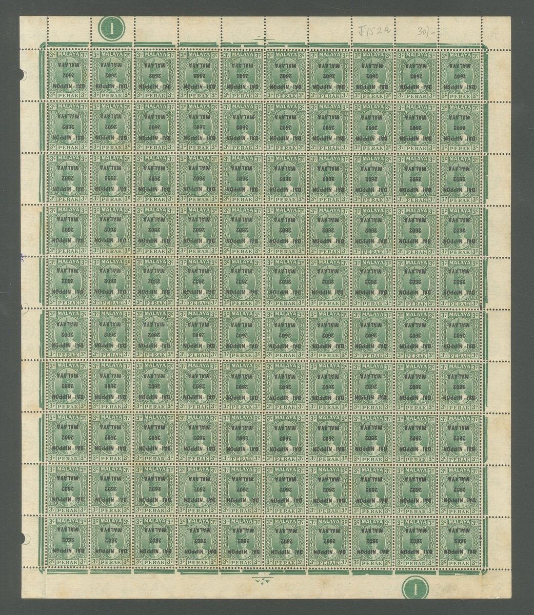 3c. green complete sheet (10x10) with overprint inverted, the gum a little tones with a few tone spots none of which affects very fine appearance. A rare multiple. ISC J165a, $7,000; S.G. J247a, £1,800