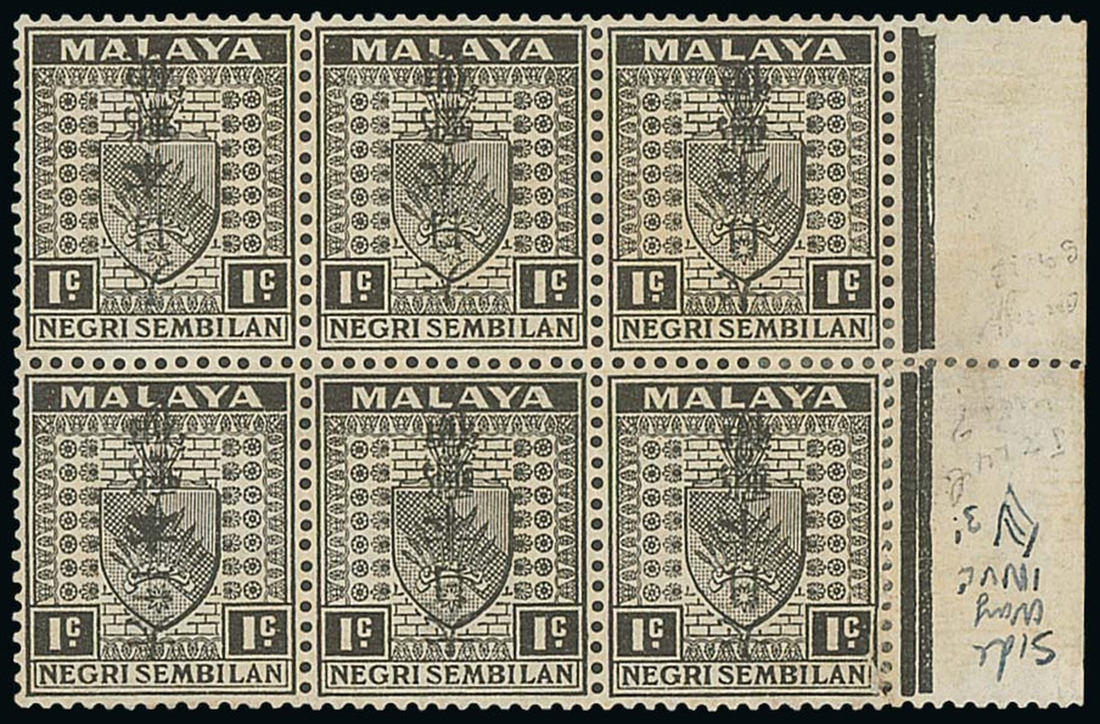 1c. black block of six (3x2) with sheet margin at right, showing variety overprint inverted and the lower left stamp with sideways second character, a little gum toned otherwise fine mint ISC J259a/c, $3,450; S.G. J266a/ba, £865. Photo