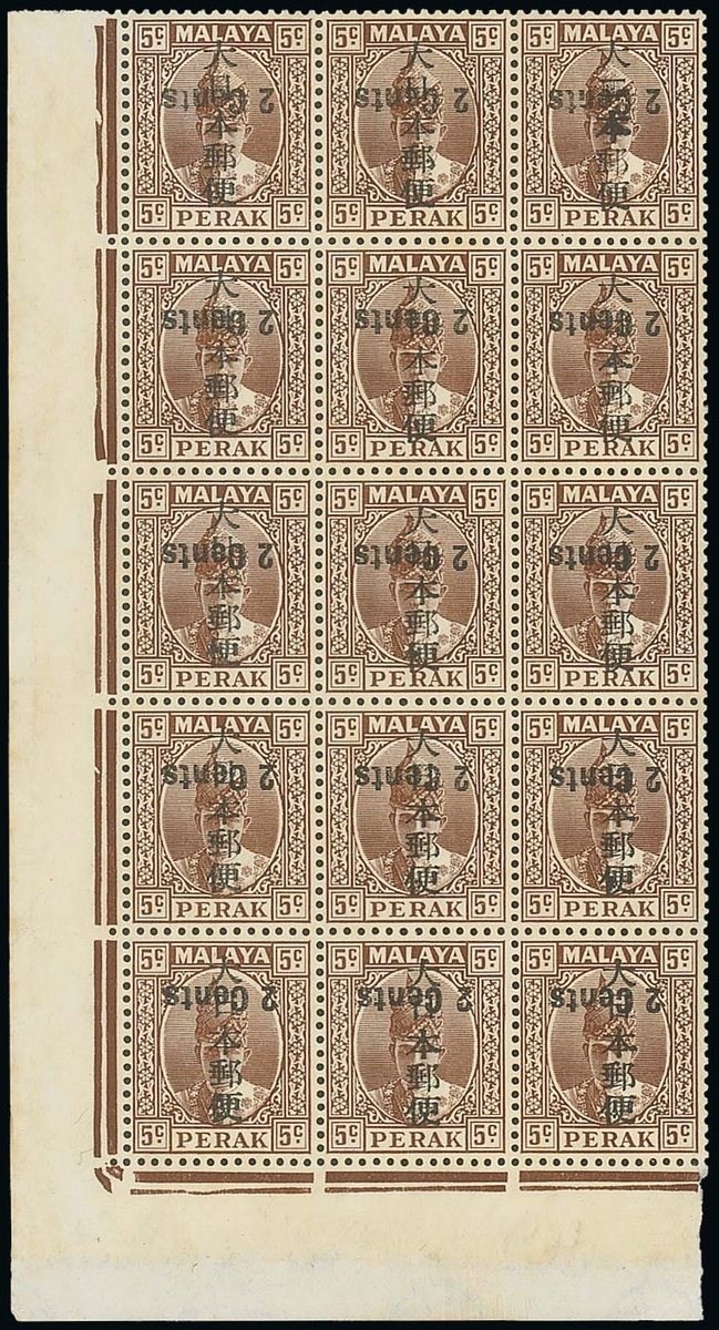 2c. (Type 22) on 5c. brown, a lower left corner block of fifteen (3x5) showing variety surcharge inverted and the top right stamp with sideways second character, unused with full original gum, fine. Rare. ISC J267b/e, $6,260; S.G. J274a/cb, £1,780. Photo