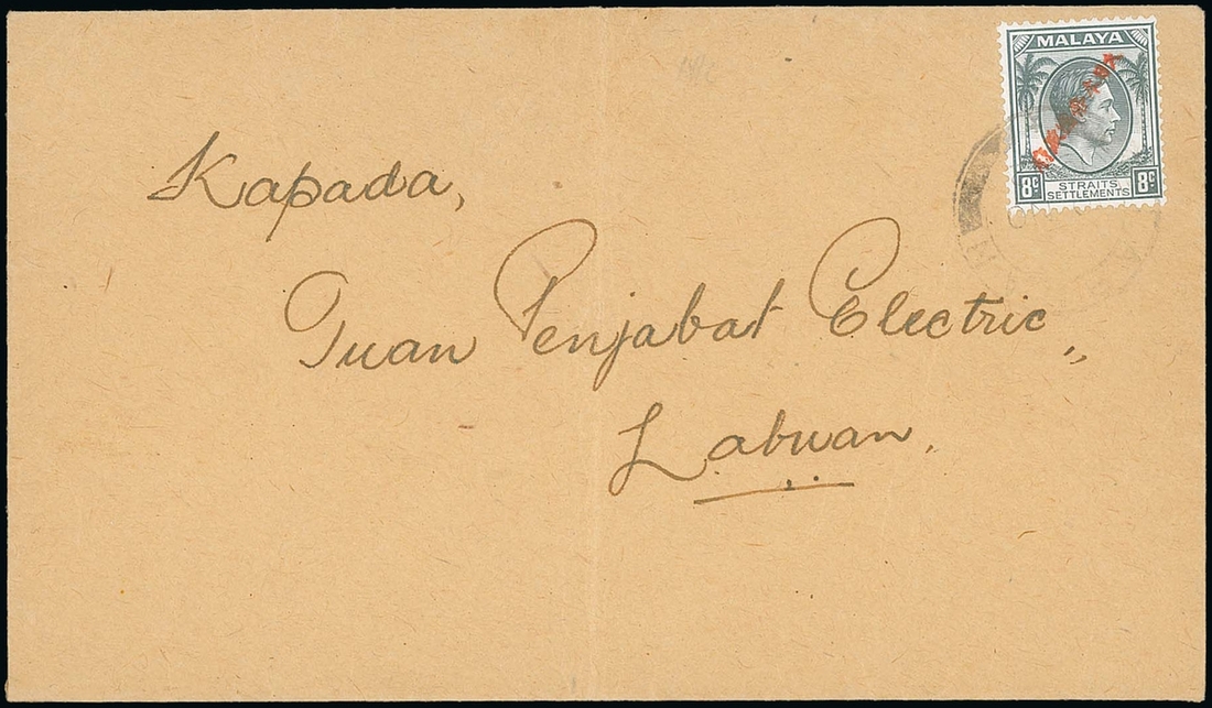 1942 (10 Nov.) locally addressed envelope bearing Straits Settlements 8c. grey with red diagonal overprint tied by Labuan double-ring d.s. (Type D11), fine. Very rare. B.P.A. Certificate (2020). Photo