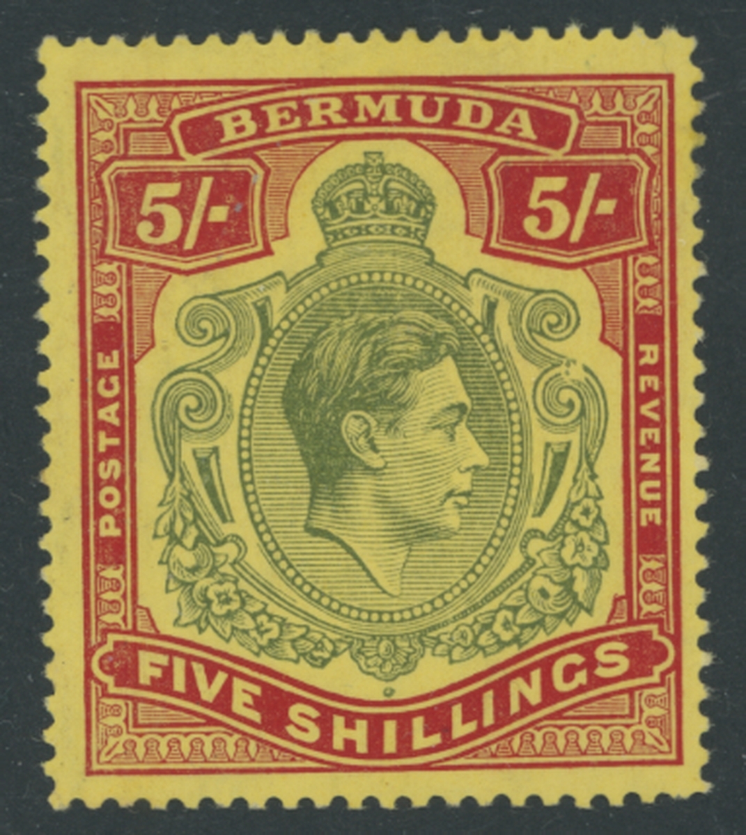 1938-53 5/- green and red keyplates (2), both with original gum, one on chalky paper showing variety "broken lower right scroll", the other on ordinary paper showing variety "missing pearl". Fine. S.G. 118be and S.G. 118ea, £2,300. Photo.