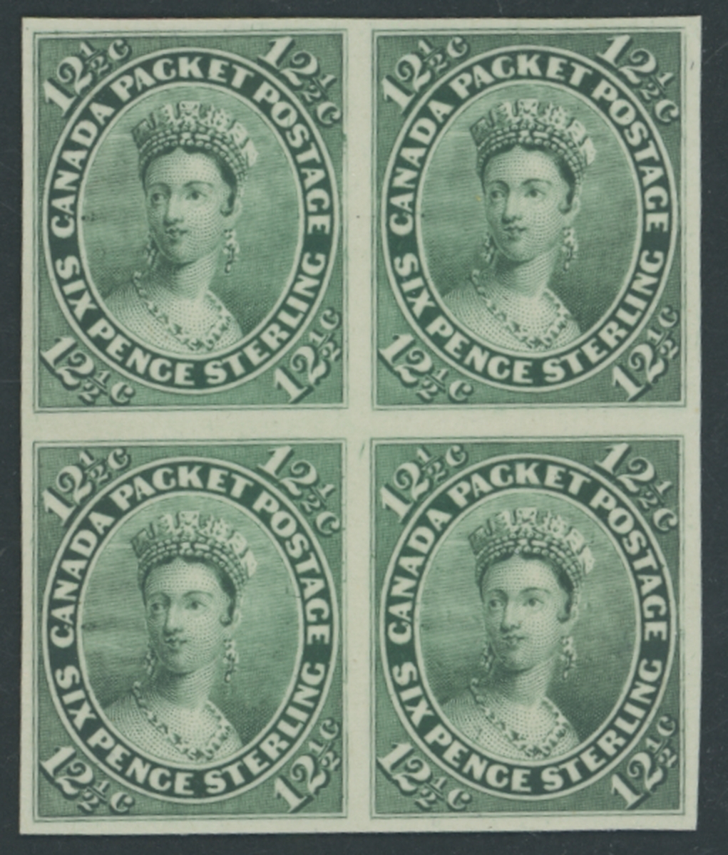1864 12½c. colour trial imperforate plate proof in green on India paper affixed to thin card; fine. Unitrade 18TC.