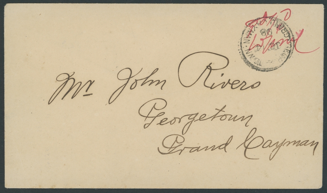1908 manuscript provisional cover, endorsed "Pd 1/4d/W.G. McC" in red, overstamped by Grand Cayman c.d.s., without flap, otherwise fine, S.G. MP2, £250. Photo.