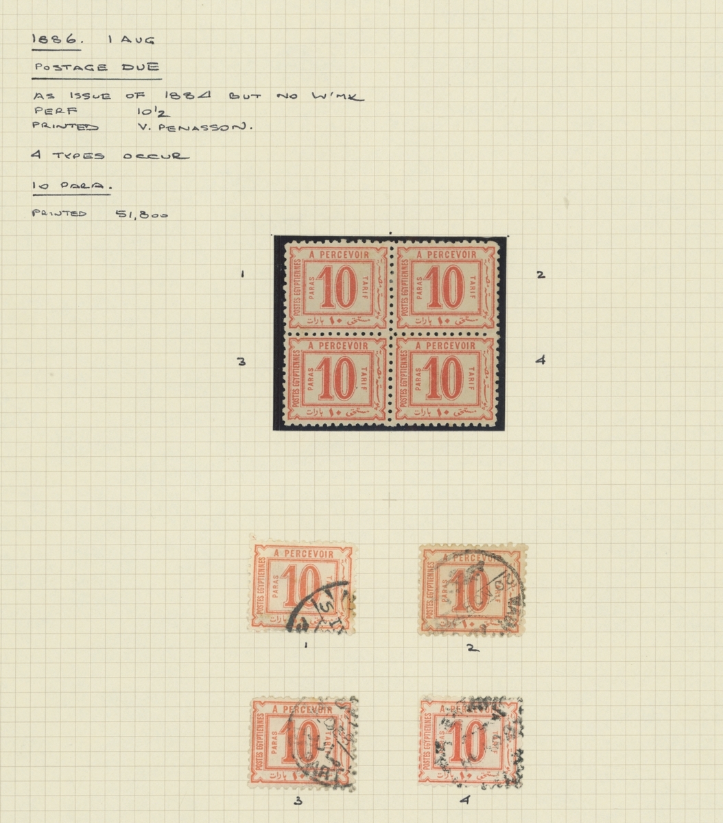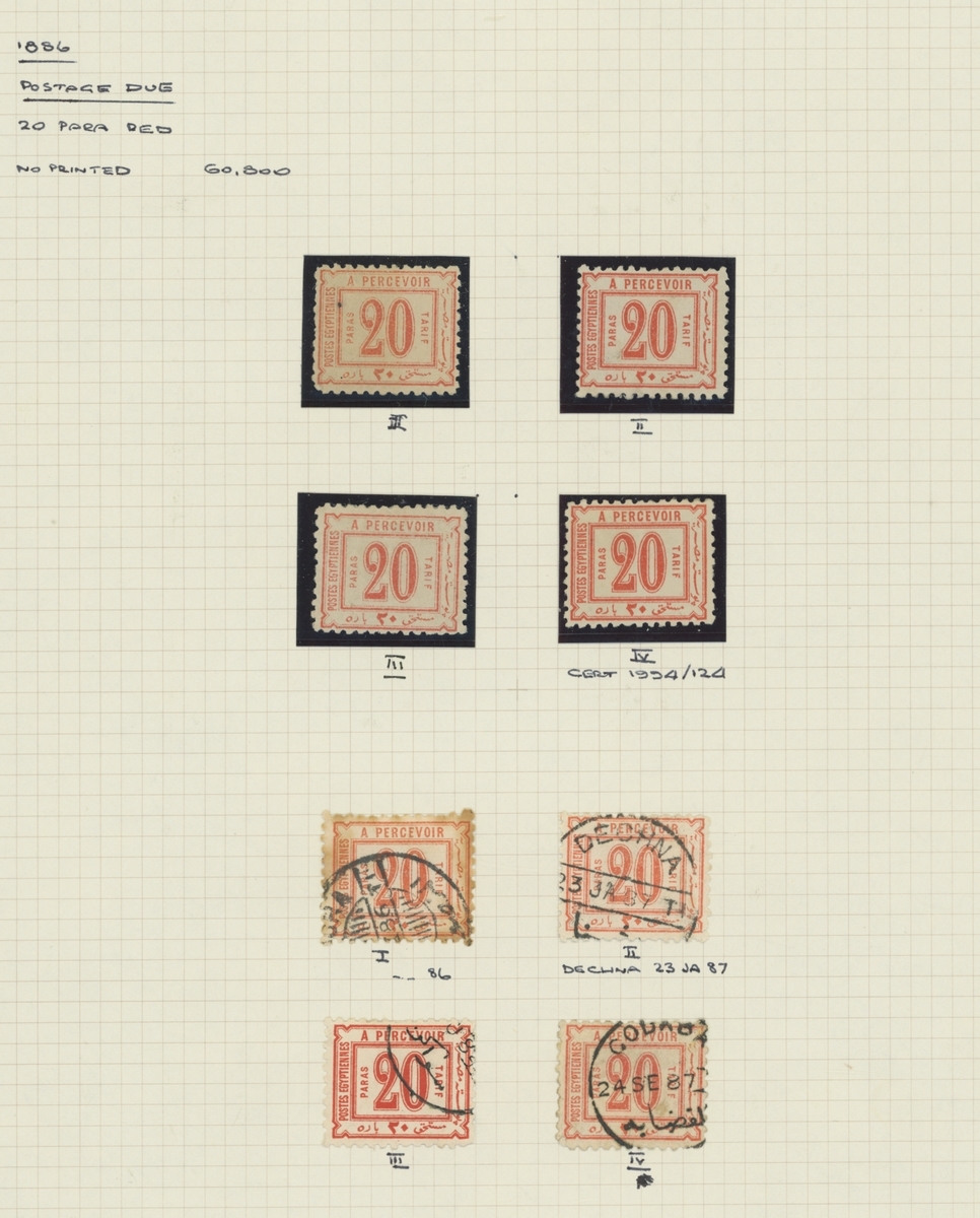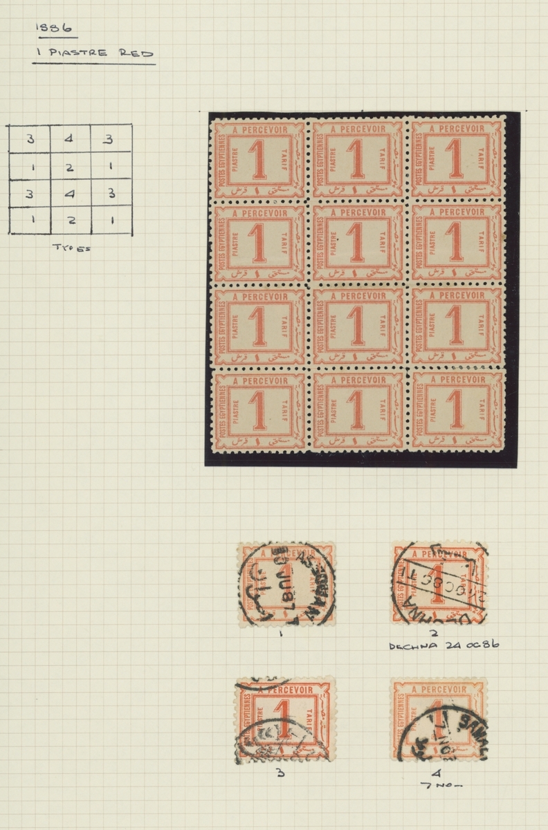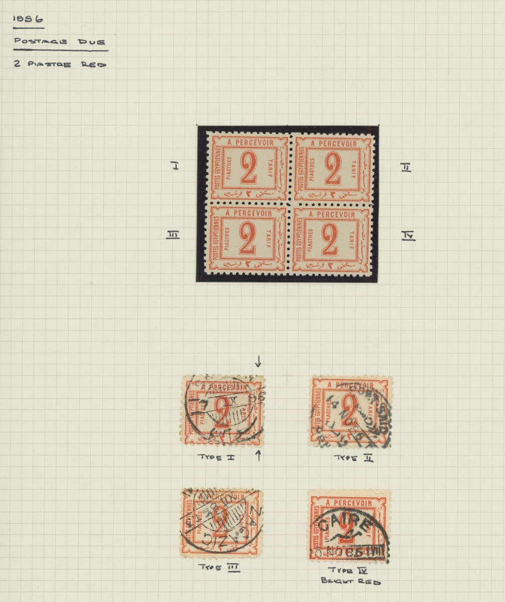 1886 postage dues specialised collection on album leaves, including 10pa. block of four unused, imperforate strip of three, 20pa. (all four types) unused, type IV with Haas cert, one used in Sawakin, 1pi. unused block of twelve, mint and used singles (7), 2pi. block of four unused, plus range of forgeries. Useful range of material for the specialist.