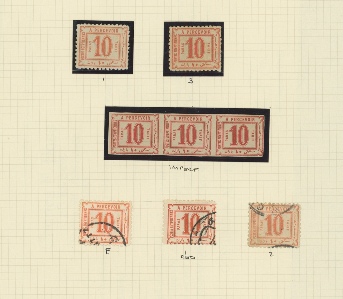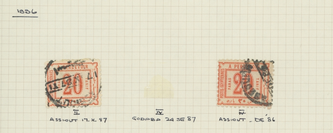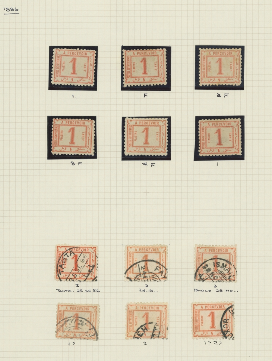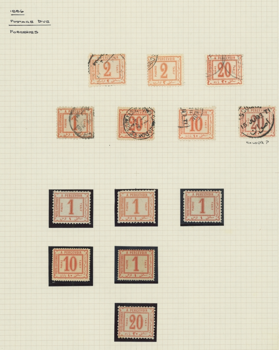1886 postage dues specialised collection on album leaves, including 10pa. block of four unused, imperforate strip of three, 20pa. (all four types) unused, type IV with Haas cert, one used in Sawakin, 1pi. unused block of twelve, mint and used singles (7), 2pi. block of four unused, plus range of forgeries. Useful range of material for the specialist.
