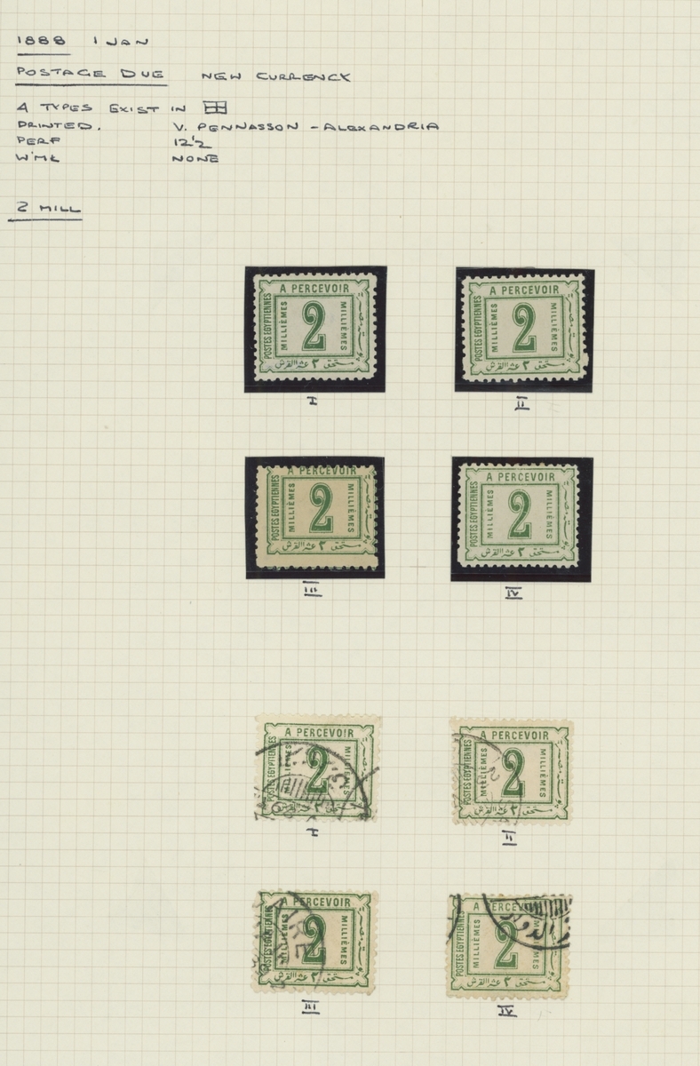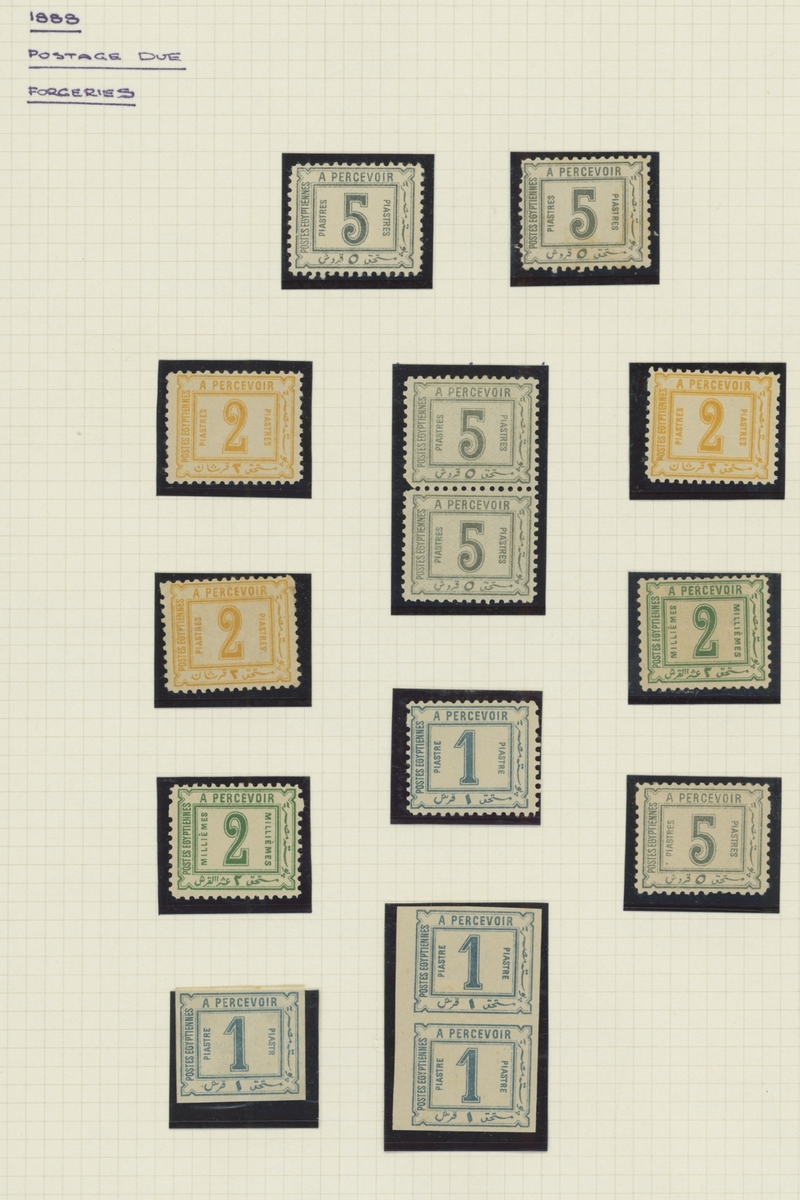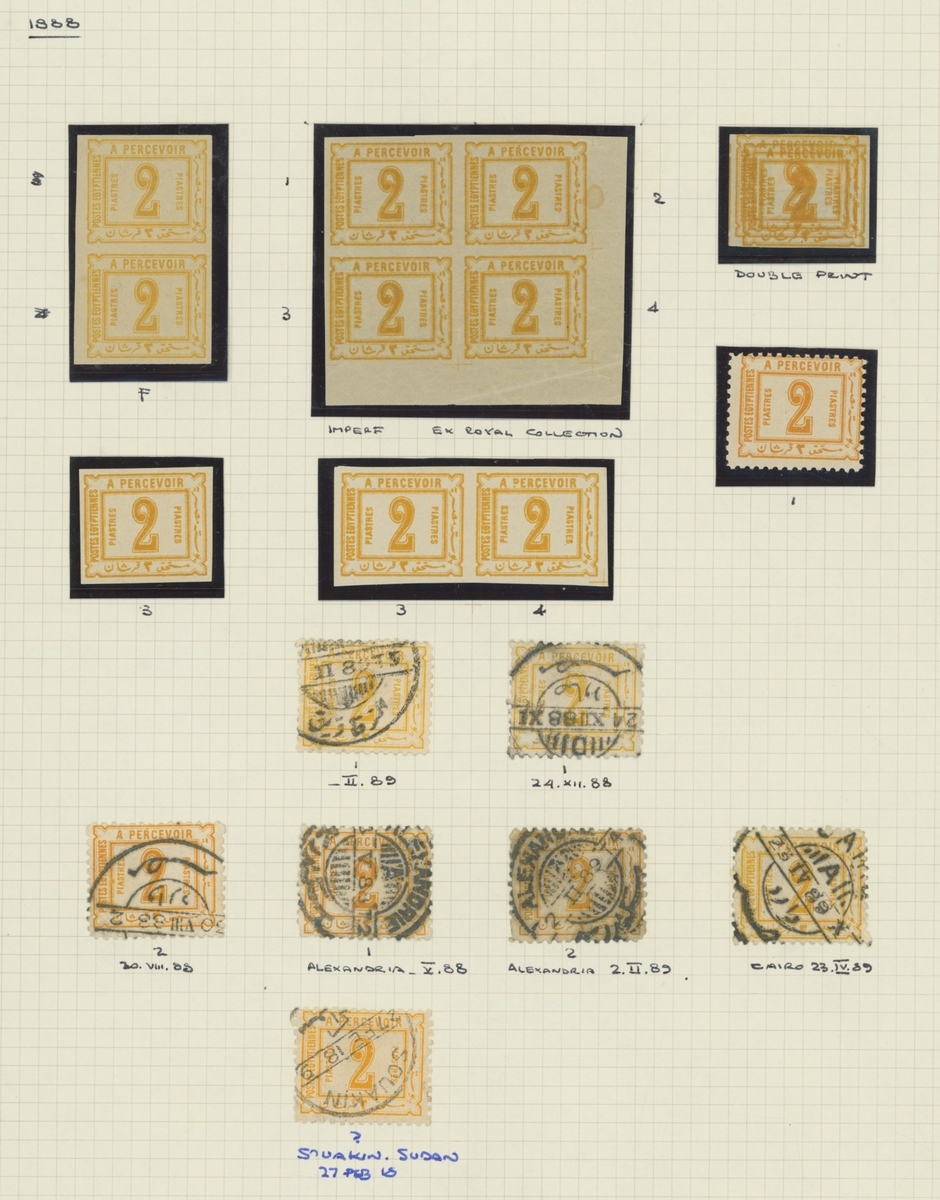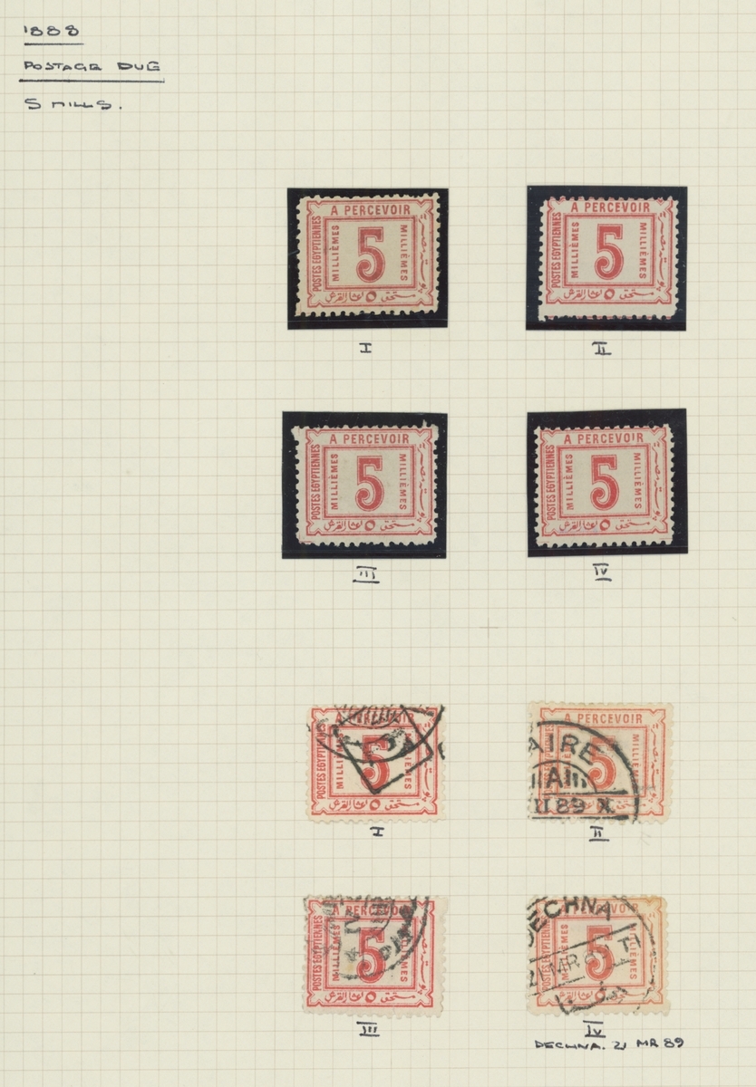 1888 postage dues specialised collection on album leaves, including four types of each value mint and used, early usage (31 Jan) fragment bearing 2m. two strips of four, 5m. with scarce guide lines, 5m. imperforate single, 1pi. imperforate proof pair and single, block of four unused, 2pi. imperforate block of four ex. the Royal collection, imperforate pair and single (one double impression), plus range of forgeries. Useful material for the specialist.