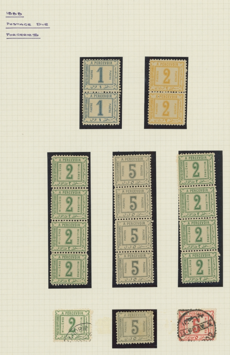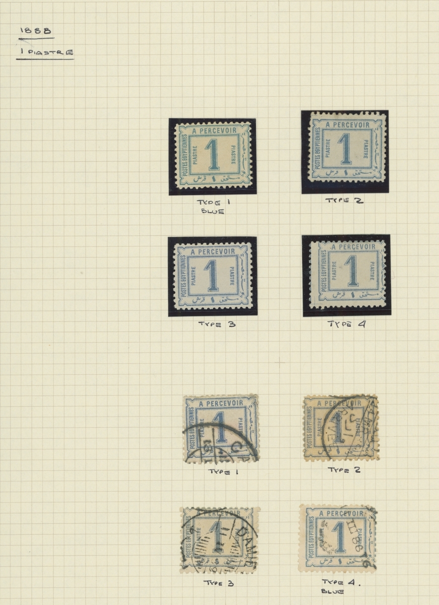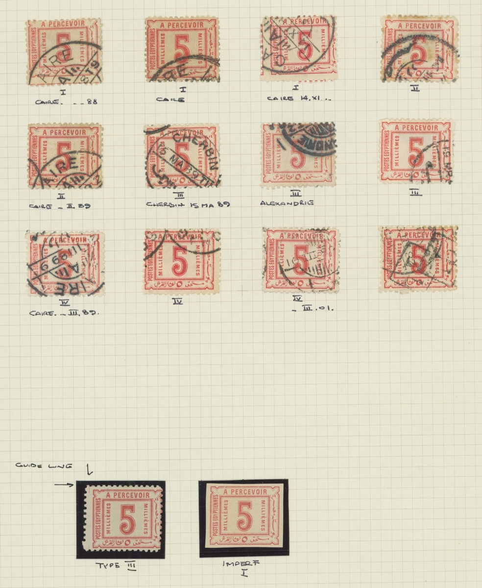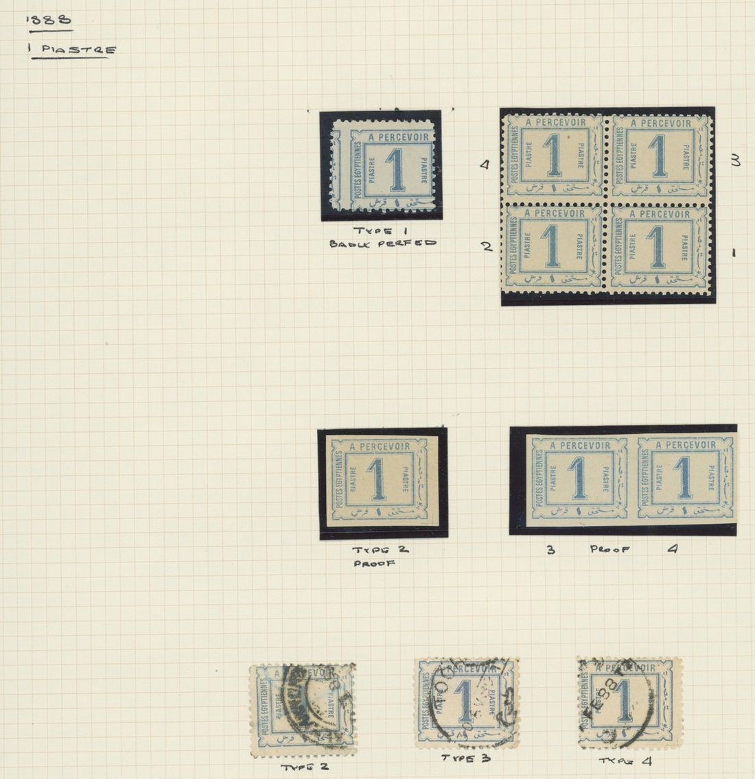1888 postage dues specialised collection on album leaves, including four types of each value mint and used, early usage (31 Jan) fragment bearing 2m. two strips of four, 5m. with scarce guide lines, 5m. imperforate single, 1pi. imperforate proof pair and single, block of four unused, 2pi. imperforate block of four ex. the Royal collection, imperforate pair and single (one double impression), plus range of forgeries. Useful material for the specialist.