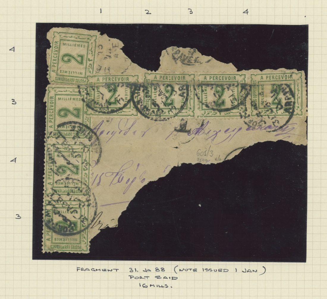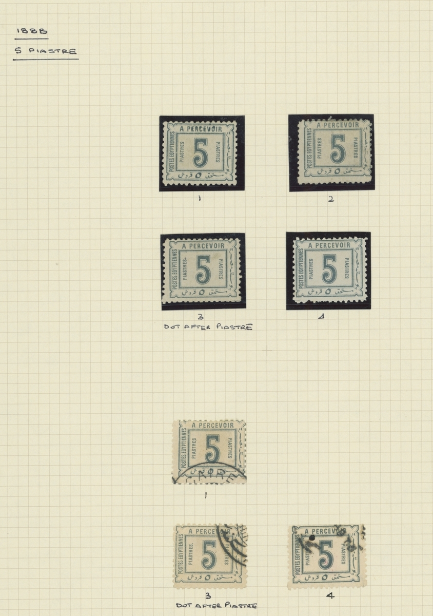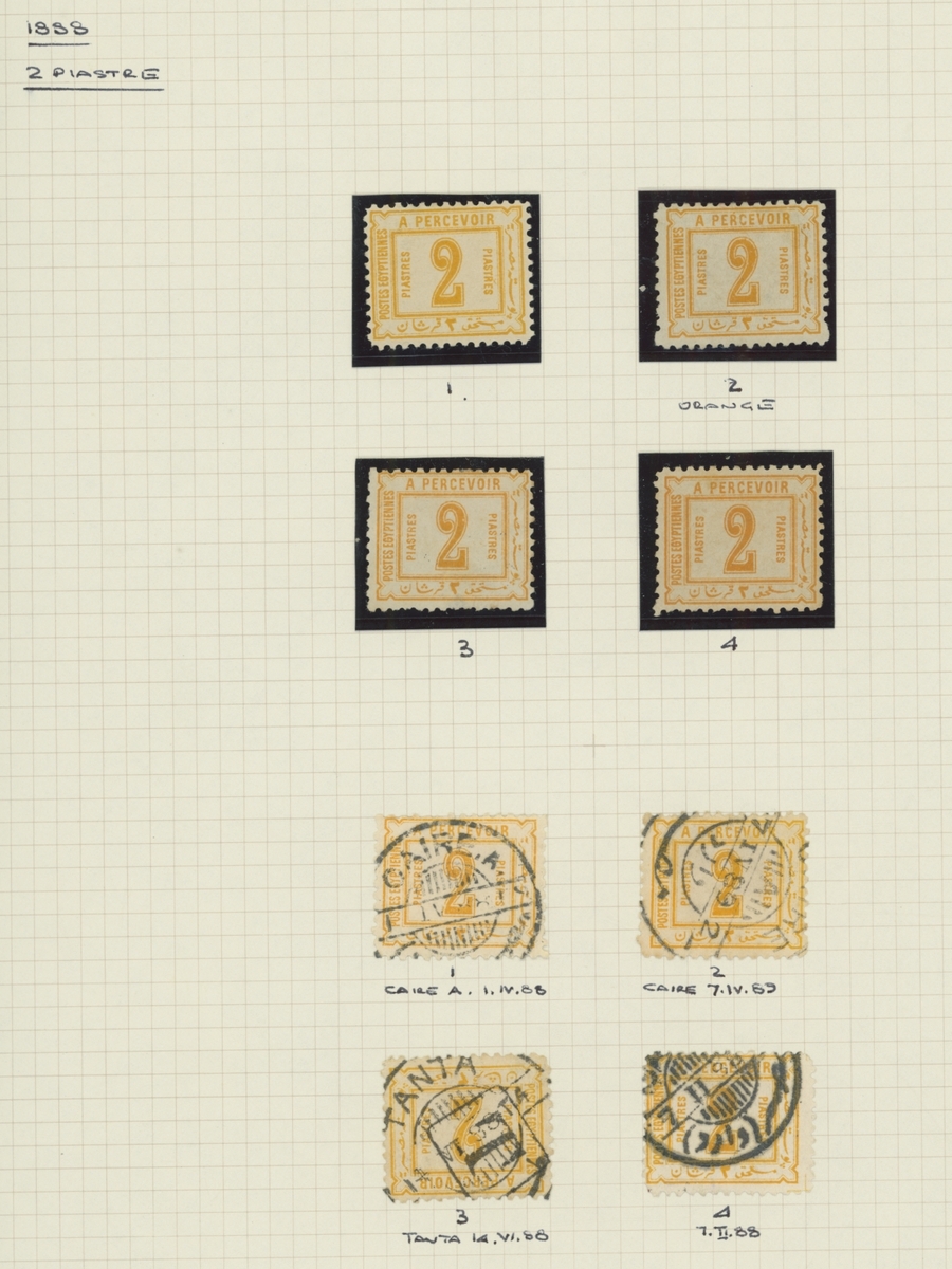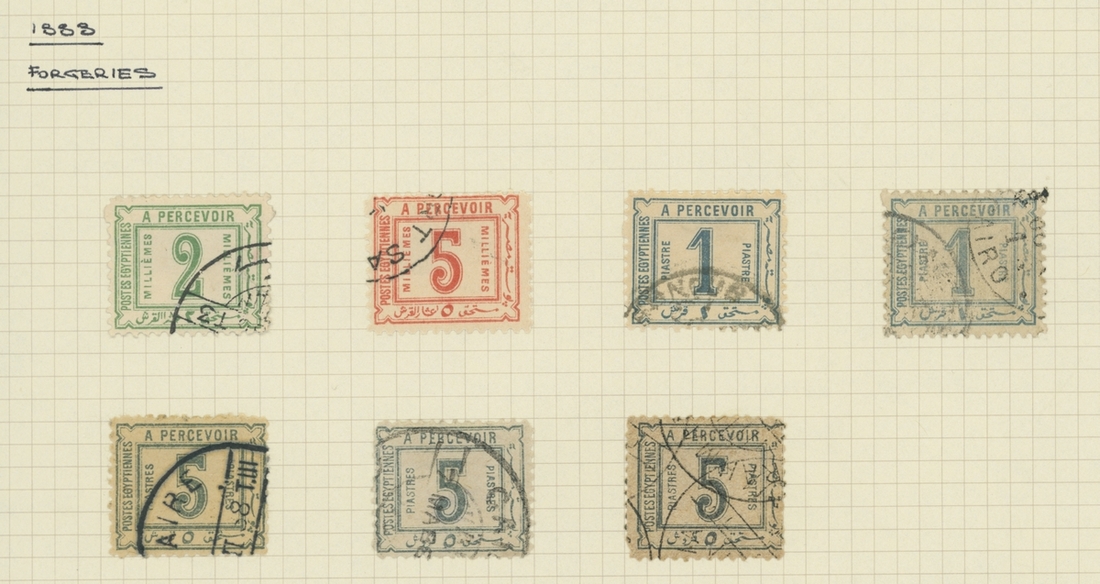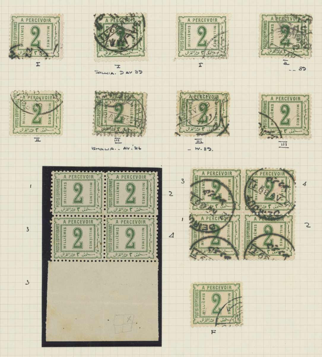 1888 postage dues specialised collection on album leaves, including four types of each value mint and used, early usage (31 Jan) fragment bearing 2m. two strips of four, 5m. with scarce guide lines, 5m. imperforate single, 1pi. imperforate proof pair and single, block of four unused, 2pi. imperforate block of four ex. the Royal collection, imperforate pair and single (one double impression), plus range of forgeries. Useful material for the specialist.