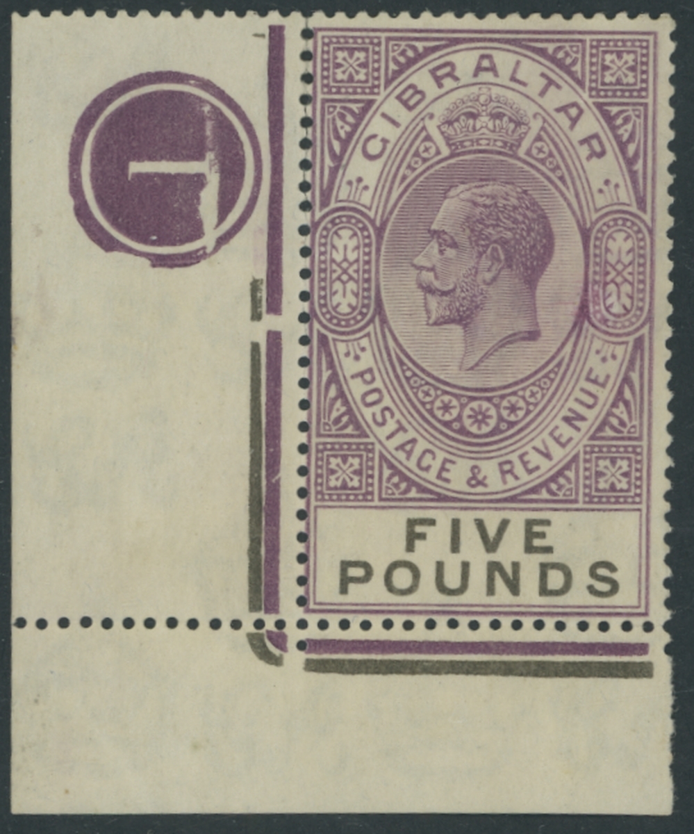 1925-32 Script £5 violet and black, a lower-left corner example with plate number 1'; fine unmounted mint. S.G. 108, £1,600