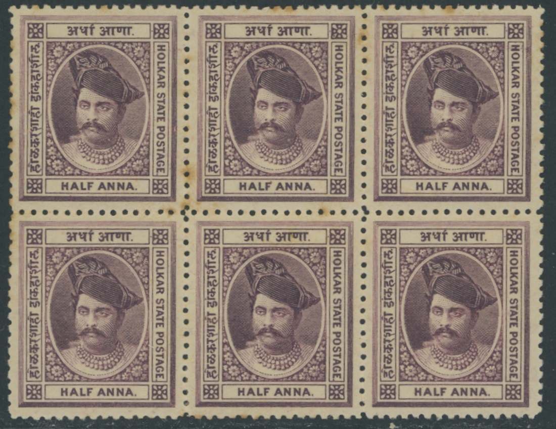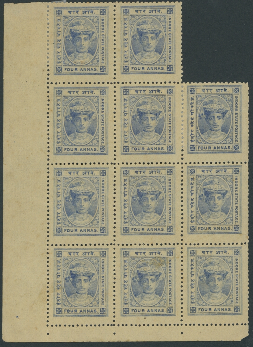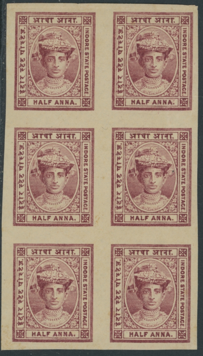 Group of mint multiples, comprising 1889-92 ½a. block of six, 1904-20 ½a. imperforate plate proof block of six on ungummed watermarked paper, 2a. blocks of four and eight, 3a. pairs (2), block of four and 4a. multiple of twelve.