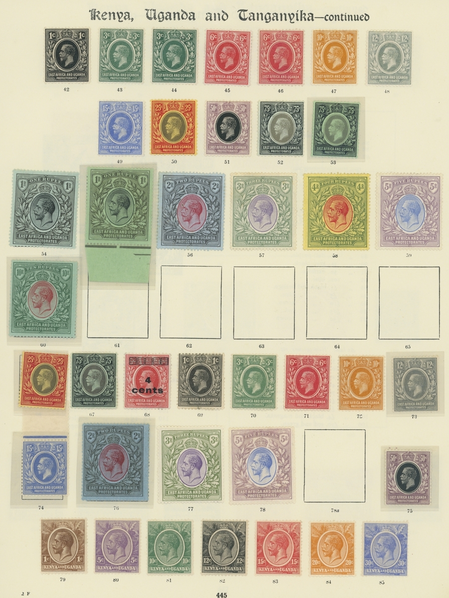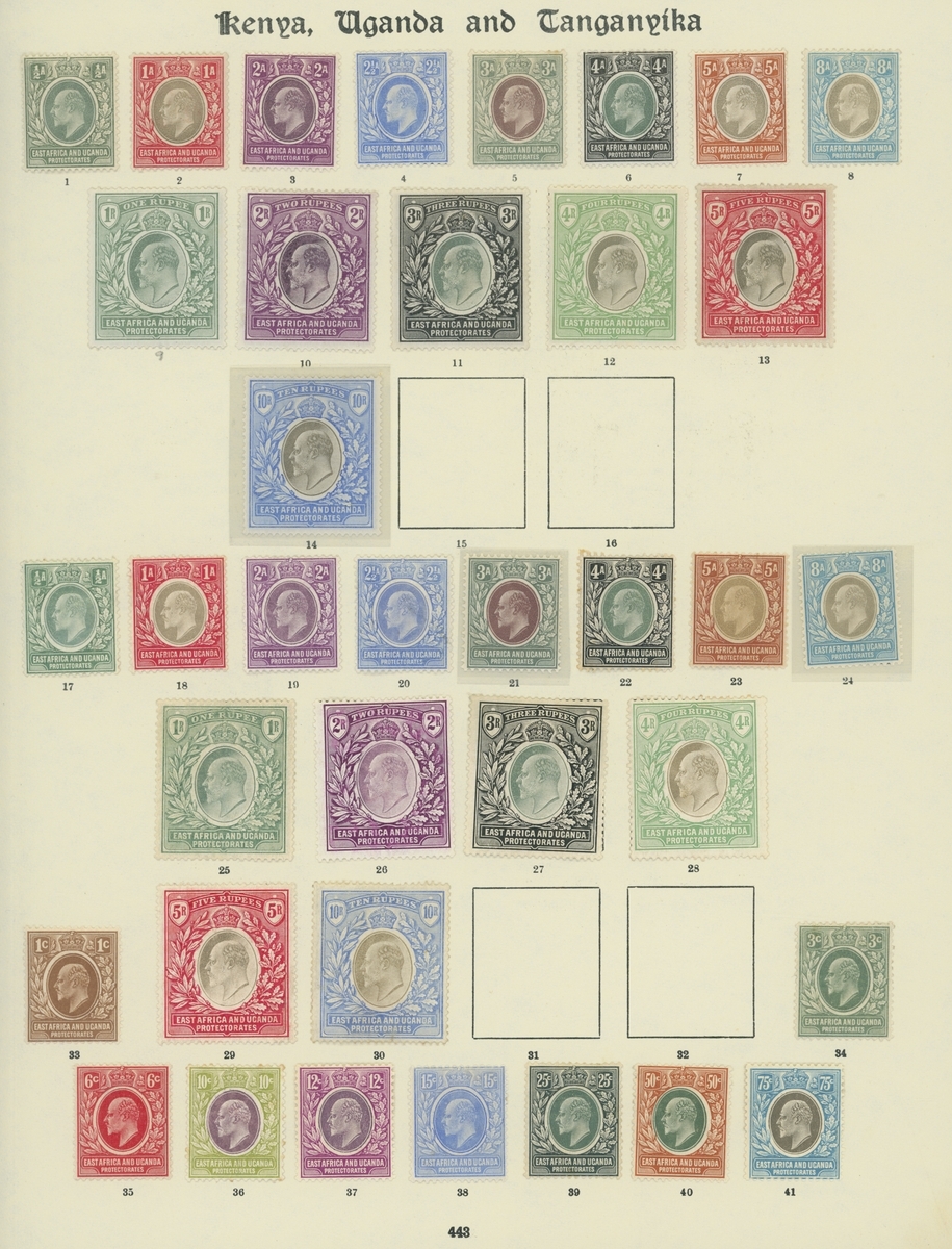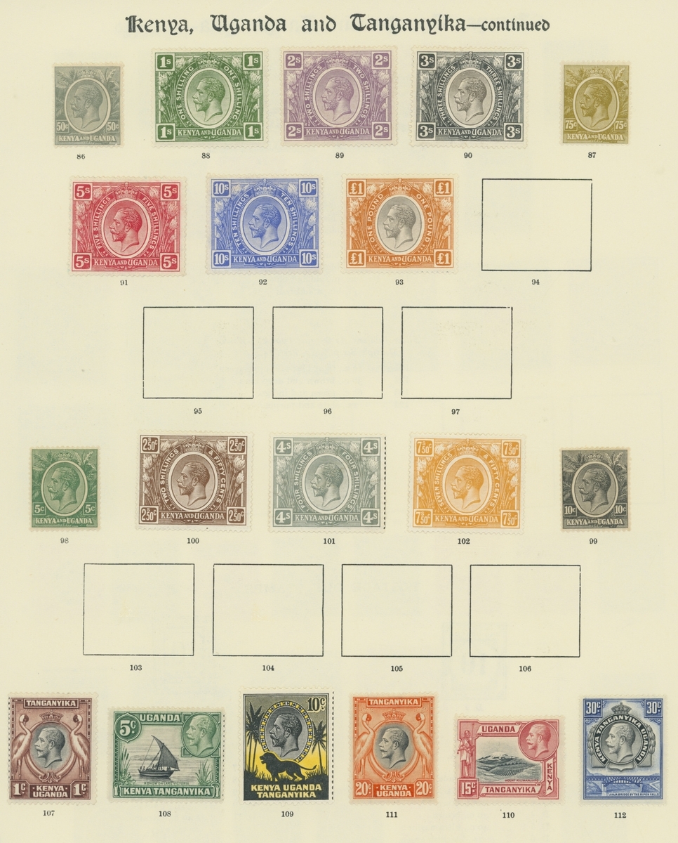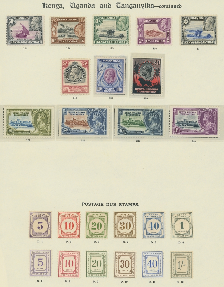 1903-1935 mint collection on album leaves, including 1903-4 set to 10r., 1904-7 set to 10r., 10r. somewhat rubbed, 1907-8 set, 1912-21 set to 10r., 1921 set to 5r., Kenya and Uganda 1922-27 set to £1, 1935-37 basic set, also 1928-33 postage dues set. Generally good to fine.